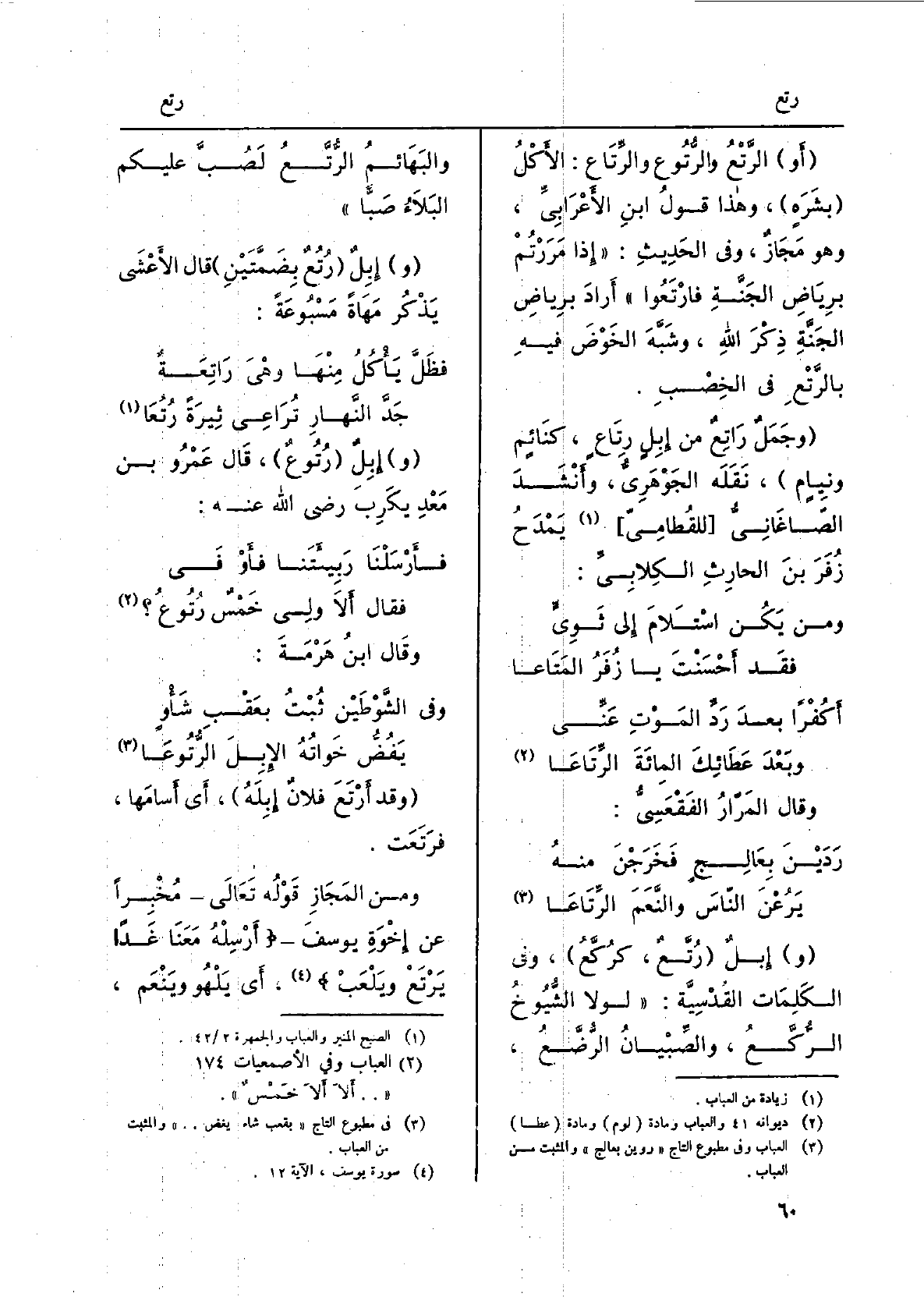 إبلٌ رُتَّعٌ، كرُكَّع، وَفِي الْكَلِمَات القُدْسِيّة: لَوْلَا الشيوخُ الرُّكَّع، والصِّبْيان الرُّضَّع، والبهائمُ الرُّتَّع لصُبَّ عَلَيْكُم البلاءُ صَبَّاً. إبلٌ رُتُعٌ بضمَّتَيْن قَالَ الْأَعْشَى يَذْكُر مَهاةً مَسْبُوعةً: