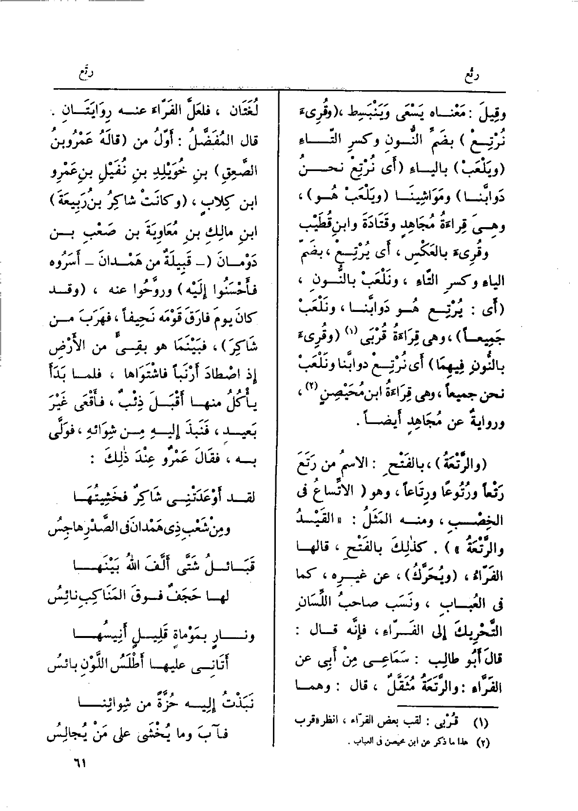 وَقيل: مَعْنَاهُ يَسْعَى ويَنْبَسِط، وقُرِئَ نُرْتِعْ بضمِّ النونِ وكسرِ التاءِ ويَلْعَبْ بِالْيَاءِ أَي نُرْتِعْ نَحن دَوابَّنا ومواشينا ويَلْعَب هُوَ، وَهِي قراءةُ مُجاهِدٍ وقَتادةَ وابنِ قُطَيْب، وقُرِئَ بِالْعَكْسِ، أَي يُرْتِعْ، بضمِّ الياءِ وكسرِ التَّاء، ونَلْعَبْ بالنُّون، أَي: يُرْتِعْ هُوَ دوابَّنا ونَلعَبْ نَحن جَمِيعًا، وَهِي قراءةُ ابنُ مُحَيْصِنٍ، وروايةٌ عَن مُجاهِدٍ أَيْضا.