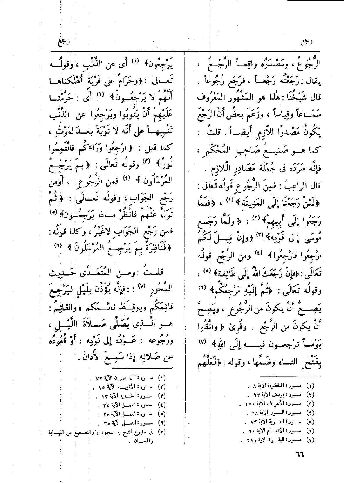 المَوت، كَمَا قيل: ارْجِعوا وراءَكُم فالْتَمِسوا نُوراً وقَوْله تَعالى: بمَ يَرْجِعُ المُرسَلون فَمن الرُّجوع، أَو من رَجْعِ الجَواب، وقَوْله تَعالى: ثمّ توَلَّ عَنْهُم فانْظُرْ مَاذَا يَرْجِعون فَمن رَجْعِ الجوابِ لَا غير، وَكَذَا قولُه: فناظِرَةٌ بمَ يَرْجِعُ المُرسَلون. قلتُ: وَمن المُتَعَدِّي حديثُ السَّحُور: فإنّه يُؤَذَّنُ بلَيلٍ ليَرْجِعَ قائِمُكُم ويوقِظَ نائِمَكم والقائمُ: هُوَ الَّذِي يُصلّي صَلاةَ اللَّيْل، ورُجوعُه: عَوْدُه إِلَى نَوْمِه، أَو قُعودُه عَن صَلاتِه إِذا سَمِعَ الْأَذَان.