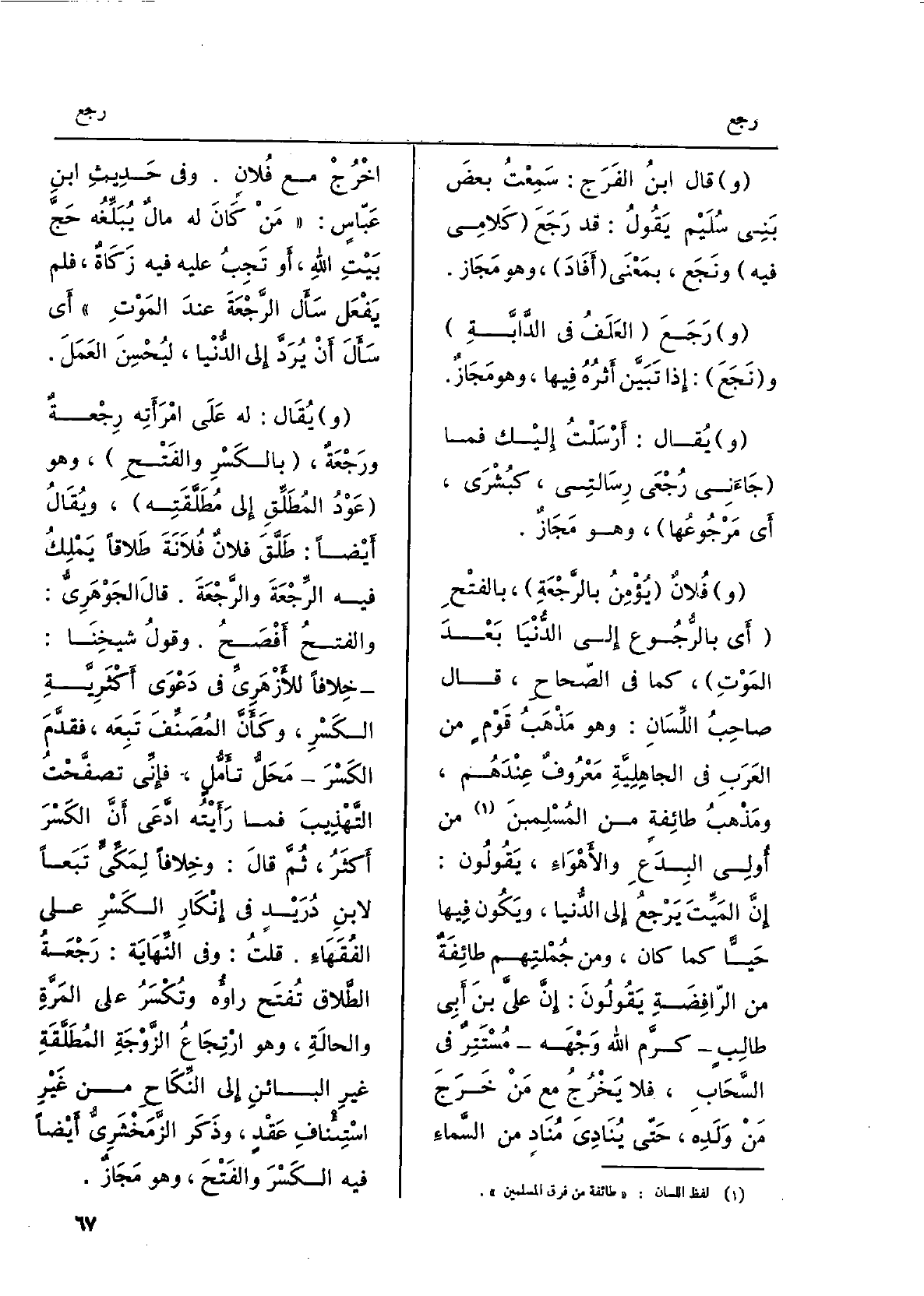 قَالَ ابنُ الفرَج: سَمعتُ بعضَ بني سُلَيم يَقُول: قد رجَعَ كَلَامي فِيهِ ونَجَع، بِمَعْنى أَفادَ، وَهُوَ مَجاز. رَجَعَ العَلَفُ فِي الدَّابَّةِ ونَجَعَ: إِذا تبيَّنَ أَثرُه فِيهَا، وَهُوَ مَجاز. يُقال: أَرسَلْتُ إليكَ فَمَا جاءَني رُجْعَى رِسالَتي، كبُشْرَى، أَي مَرجوعُها، وَهُوَ مَجاز. فُلانٌ يؤْمِنُ بالرَّجْعَةِ، بِالْفَتْح: أَي بالرُّجوع إِلَى الدُّنيا بعدَ المَوتِ، كَمَا فِي الصِّحاح، قَالَ صاحبُ اللسانِ: وَهُوَ مَذْهب قومٍ من العَرَبِ فِي الجاهِليَّةِ مَعروفٌ عندَهُم، ومَذْهب طائفَةٍ من المُسلِمينَ من أُولي البِدَعِ والأَهواءِ، يَقُولُونَ: إنَّ المَيِّتَ يرجعُ إِلَى الدُّنيا ويكونُ حَيَّاً كَمَا كَانَ، وَمن جُملتِهم طائفةٌ من الرَّافضَةِ يَقُولُونَ: إنَّ عليَّ بنَ أَبي طالبٍ، كرَّم الله وجهَه، مَسْتَتِرٌ فِي السَّحابِ، فَلَا يَخرُجُ مَعَ من خرَجَ من ولَدِه، حتّى يُنادي مُنادٍ من السَّماءِ اخْرُجْ مَعَ فُلانٍ. وَفِي حَدِيث ابْن عَبّاسٍ: مَنْ كَانَ لَهُ مالٌ يُبَلِّغُهُ حَجَّ بيتِ الله، أَو تُجِبُ عَلَيْهِ فِيهِ زَكاةٌ، فَلم يَفعل سأَل الرَّجْعَةَ عندَ المَوتِ أَي سألَ أَنْ يُرَدَّ إِلَى الدُّنيا، ليُحْسِنَ العملَ. يُقال: لَهُ على امْرأَتِه رِجْعَةٌ ورَجْعَةٌ، بالكسْر وَالْفَتْح، وَهُوَ عَوْدُ المُطلِّق إِلَى مُطَلَّقَتِه، وَيُقَال أَيضاً طَلَّقَ فُلانٌ فلانَةَ طَلاقاً يَملِكُ فِيهِ الرِّجْعَةَ والرَّجْعَةَ. قَالَ الجَوْهَرِيُّ: والفتحُ أَفصَحُ. وقولُ شيخِنا: خِلافاً للأَزهريِّ فِي دَعوَى أَكْثَرِيَّة الكَسْر، وكأَنَّ المُصَنِّفَ تبعَه، فقدَّمَ الكَسْرَ، مَحَلُّ تأَمُّلٍ، فإنِّي تَصَفَّحْتُ التَّهذيبَ فَمَا رأَيتُه ادَّعى أَنَّ الكسرَ أَكثَرُ، ثمَّ قَالَ: وخِلافاً لِمَكِّيٍّ تَبَعاً لابنِ دُريدٍ فِي إِنْكَار الكَسرِ على الفُقهاءِ. قلتُ: وَفِي النِّهايَة: رَجْعَةُ الطَّلاقِ تُفْتَحُ راؤُهُ وتُكْسَرُ على المَرَّةِ والحالَةِ، وَهُوَ ارتِجاعُ الزَّوْجَةِ المُطَلَّقَةِ غيرِ البائنِ إِلَى النِّكاحِ من غيرِ اسْتِئْنافِ عَقْدٍ، وذكَرَ الزّمخشريُّ أَيضاً فِيهِ الكَسْرَ والفتحَ، وَهُوَ مَجاز.