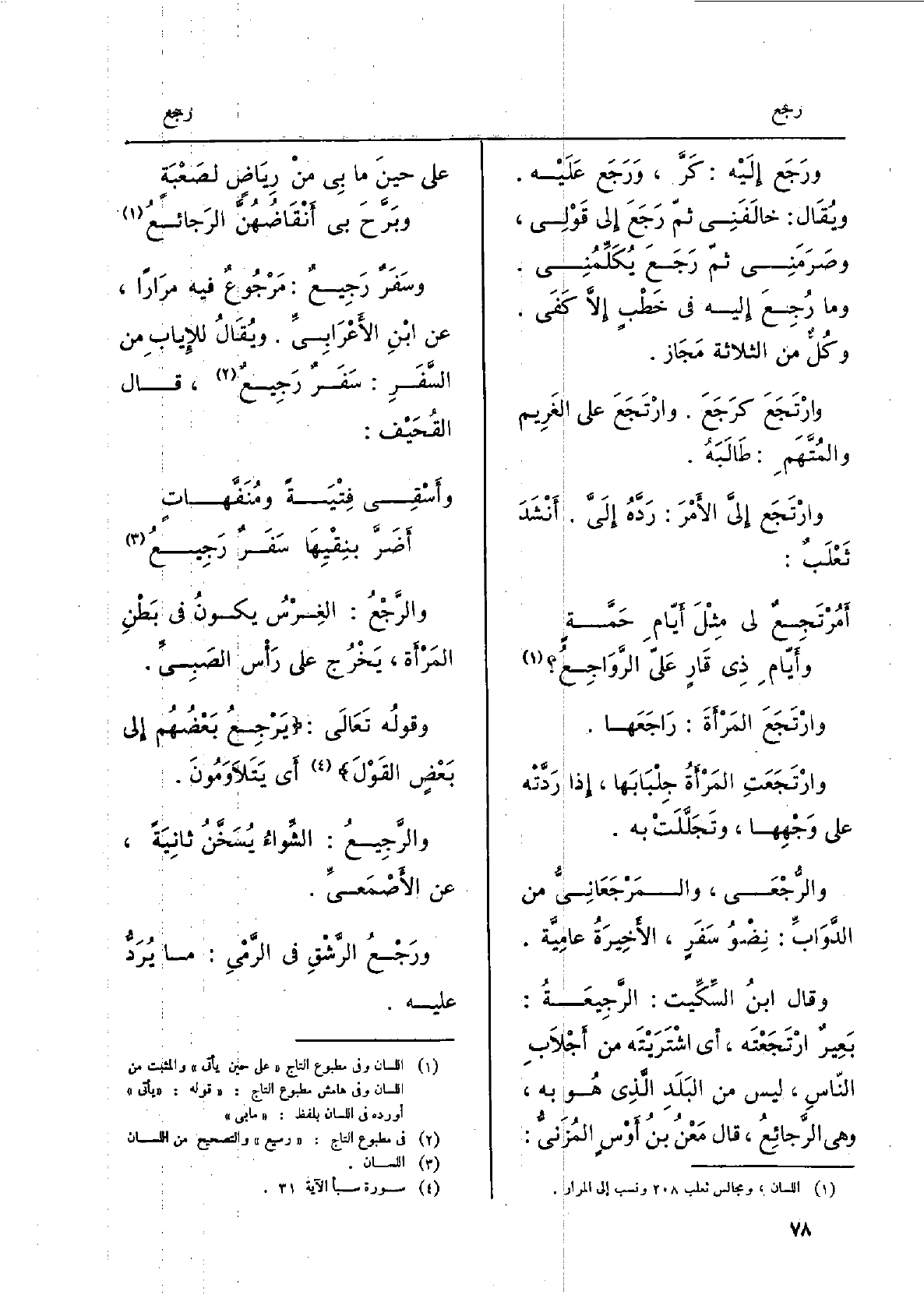 وسفَرٌ رَجيعٌ: مَرْجُوعٌ فِيهِ مِراراً، عَن ابْن الأَعْرابِيّ. وَيُقَال للإيابِ من السفَر: سفَرٌ رَجيعٌ، قَالَ القُحَيْف:
