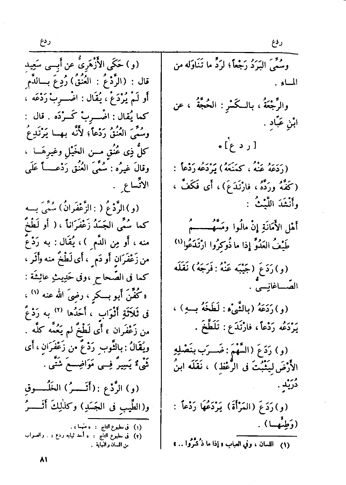 رَدَعَ جَيْبَه عَنهُ: فَرَجَه، نَقَلَه الصَّاغانِيّ. رَدَعَه بالشيءِ: لَطَخَه بِهِ، يَرْدَعُه رَدْعَاً، فارْتَدعَ: تلَطَّخ. رَدَعَ السهمَ: ضَرَبَ بنَصلِه الأرضَ ليَثبُتَ فِي الرُّعْظ، نَقَلَه ابْن دُرَيْدٍ. رَدَعَ المرأةَ يَرْدَعُها رَدْعَاً: وَطِئَها. حكى الأَزْهَرِيّ عَن أبي سعيدٍ قَالَ: الرَّدْع: العُنُقُ رُدِعَ بالدَّمِ أَو لم يُردَعْ، يُقَال: اضْرِبْ رَدْعَه، كَمَا يُقَال: اضرِبْ كَرْدَه. قَالَ: وسُمِّي العُنُقُ رَدْعَاً لأنّه بهَا يَرْتَدِعُ كلُّ ذِي عُنُقٍ من الخَيلِ وغيرِها، وَقَالَ غيرُه: سُمِّي العنُقُ رَدْعَاً على الاتِّساع. الرَّدْع: الزَّعْفَرانُ سُمِّي بِهِ كَمَا سُمِّي الجسَدُ زَعْفَراناً، يُقَال: بِهِ رَدْعٌ من زَعْفَرانٍ أَو دمٍ، أَي لَطْخٌ مِنْهُ وأثَر، كَمَا فِي الصِّحَاح، وَفِي حديثِ عَائِشَة: كُفِّنَ أَبُو بكرٍ، رَضِيَ اللهُ عَنهُ، فِي ثلاثةِ أَثْوَابٍ، أحدُها بِهِ رَدْعٌ من زَعْفَران. أَي لطخٌ لم يَعُمَّه كلَّه. وَيُقَال: بالثَّوبِ رَدْعٌ من زَعْفَرانٍ، أَي شيءٌ يسيرٌ فِي مواضِعَ شَتَّى. الرَّدْع: أَثَرُ الخَلُوقِ والطِّيبِ فِي الجسَدِ وَكَذَلِكَ أثرُ