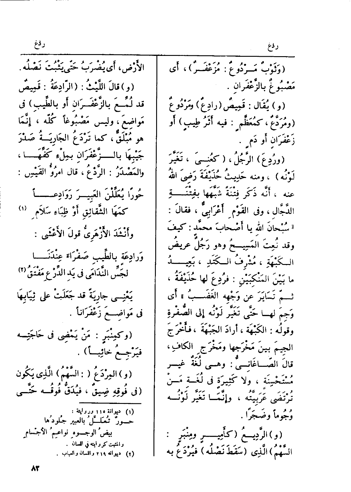 وثَوبٌ مَرْدُوعٌ: مُزَعْفَرٌ، أَي مَصْبُوغٌ بالزَّعفَران. يُقَال: قَميصٌ رادِعٌ ومَرْدُوع ومُرَدَّعٌ، كمُعَظَّمٍ: فِيهِ أثَرُ طِيبٍ أَو زَعْفَرانٍ أَو دَمٍ. ورُدِعَ الرجلُ، كعُنِيَ، تغَيَّرَ لَوْنُه، وَمِنْه حديثُ حُذَيْفةَ رَضِيَ اللهُ عَنهُ، أنّه ذَكَرَ فِتنَةً شبَّهَها بفِتنَةِ الدَّجَّالِ، وَفِي القومِ أَعْرَابيٌّ، فَقَالَ: سُبحانَ اللهِ يَا أصحابَ مُحَمَّد: كيفَ وَقد نُعِتَ المَسيحُ وَهُوَ رجلٌ عريضُ الكَبْهَةِ، مُشرِفُ الكَتَدِ، بعيدُ مَا بَيْنَ المَنْكِبَيْن، فرُدِعَ لَهَا حُذَيْفةُ، ثمّ تَسايَرَ عَن وَجْهِه الغضبُ. أَي وَجِمَ لَهَا حَتَّى تغَيَّرَ لَوْنُه إِلَى الصُّفرة، وقولُه: الكَبْهَة، أرادَ الجَبهة، فَأَخْرجَ الجيمَ بينَ مَخْرَجها ومَخْرَجِ الكافِ، قَالَ الصَّاغانِيّ: وَهِي لغةٌ غيرُ مُستَحسَنَةٍ، وَلَا كثيرةٍ فِي لغةِ مَن تُرتَضى عرَبِيَّتُه، وإنّما تغَيَّرَ لَوْنُه وُجوماً وضَجَرَاً. الرَّديع كأميرٍ ومِنْبَرٍ: السهمُ الَّذِي سَقَطَ نَصْلُه فيُرْدَعُ بِهِ الأَرْض، أَي يُضرَبُ حَتَّى يَثْبُتَ نَصْلُه. قَالَ الليثُ: الرَّادِعة: قَميصٌ قد لُمِّعَ بالزعفَرانِ أَو بالطِّيب فِي مواضِع، وَلَيْسَ مَصْبُوغاً كلّه، إنّما هُوَ مُبْلَقٌّ، كَمَا تَرْدَعُ الجارِيَةُ صَدْرَ جَيْبِها بالزعفرانِ بمِلءِ كَفِّها، والمصدرُ: الرَّدْع، قَالَ امرؤُ القَيس: