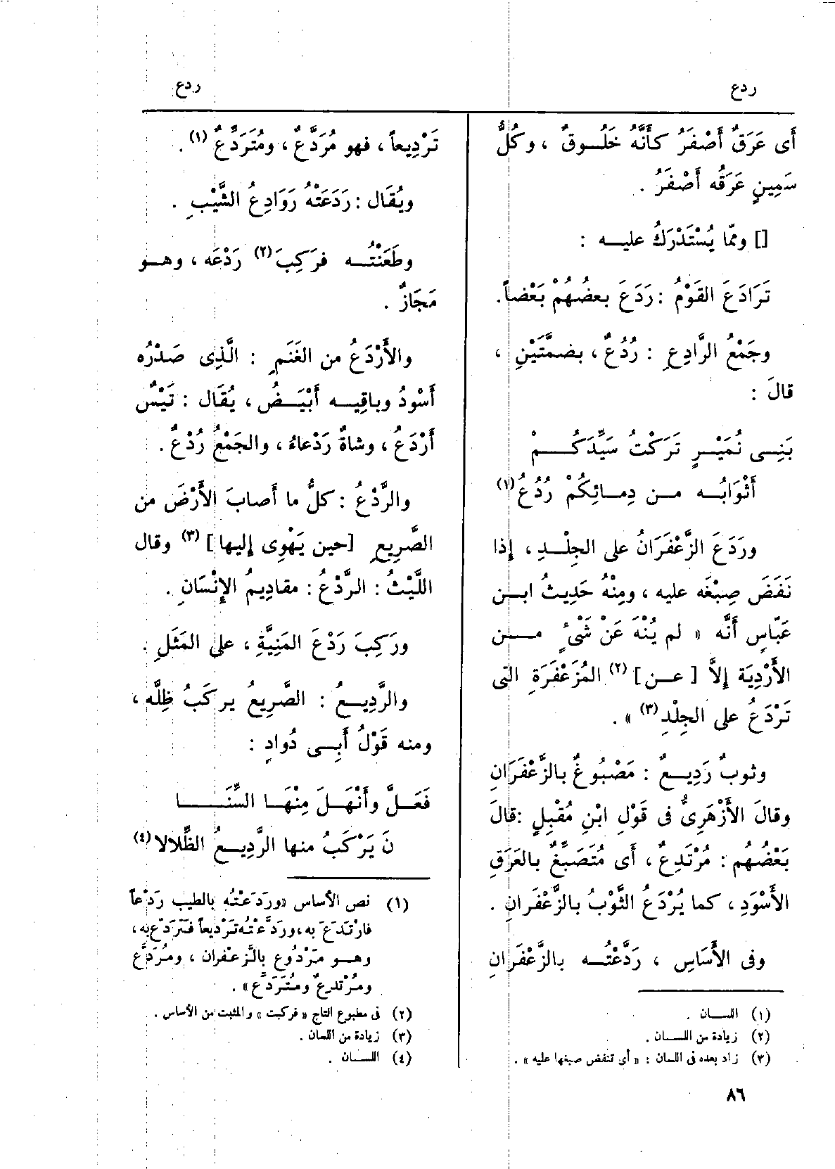 وَرَدَعَ الزعفَرانُ على الجِلْدِ، إِذا نَفَضَ صِبْغَه عَلَيْهِ، وَمِنْه حديثُ ابنِ عَبّاس أنّه: لم يُنْهَ عَن شيءٍ من الأَرْدِيَةِ إلاّ عَن المُزَعْفَرَةِ الَّتِي تَرْدَعُ على الجِلْد. وثوبٌ رَديعٌ: مَصْبُوغٌ بالزَّعفَرانِ وَقَالَ الأَزْهَرِيّ فِي قولِ ابنِ مُقبِل: قَالَ بعضُهم: مُرْتَدِعٌ، أَي مُتَصَبِّغٌ بالعَرَقِ الأسْوَد، كَمَا يُردَعُ الثوبُ بالزعفَران. وَفِي الأساس: رَدَّعْتُه بالزَّعْفَرانِ تَرْدِيعاً، فَهُوَ مُرَدَّعٌ، ومُتَرَدِّعٌ. وَيُقَال: رَدَعَتْه رَوادِعُ الشَّيب. وطَعَنْتُه فرَكِبَ رَدْعَه، وَهُوَ مَجاز. والأَرْدَعُ من الغنَمِ: الَّذِي صَدْرُه أسودُ وباقِيهِ أَبْيَضُ، يُقَال: تَيْسٌ أَرْدَعُ، وشاةٌ رَدْعَاء، والجَمعُ رُدْعٌ. والرَّدْع: كلُّ مَا أصابَ الأرضَ من الصَّريعِ حِين يَهْوِي إِلَيْهَا وَقَالَ الليثُ: الرَّدْع: مقاديمُ الْإِنْسَان. ورَكِبَ رَدْعَ المَنيَّةِ، على المَثَل. والرَّديع: الصريعُ يَرْكَبُ ظِلَّه، وَمِنْه قولُ أبي دُوادٍ: