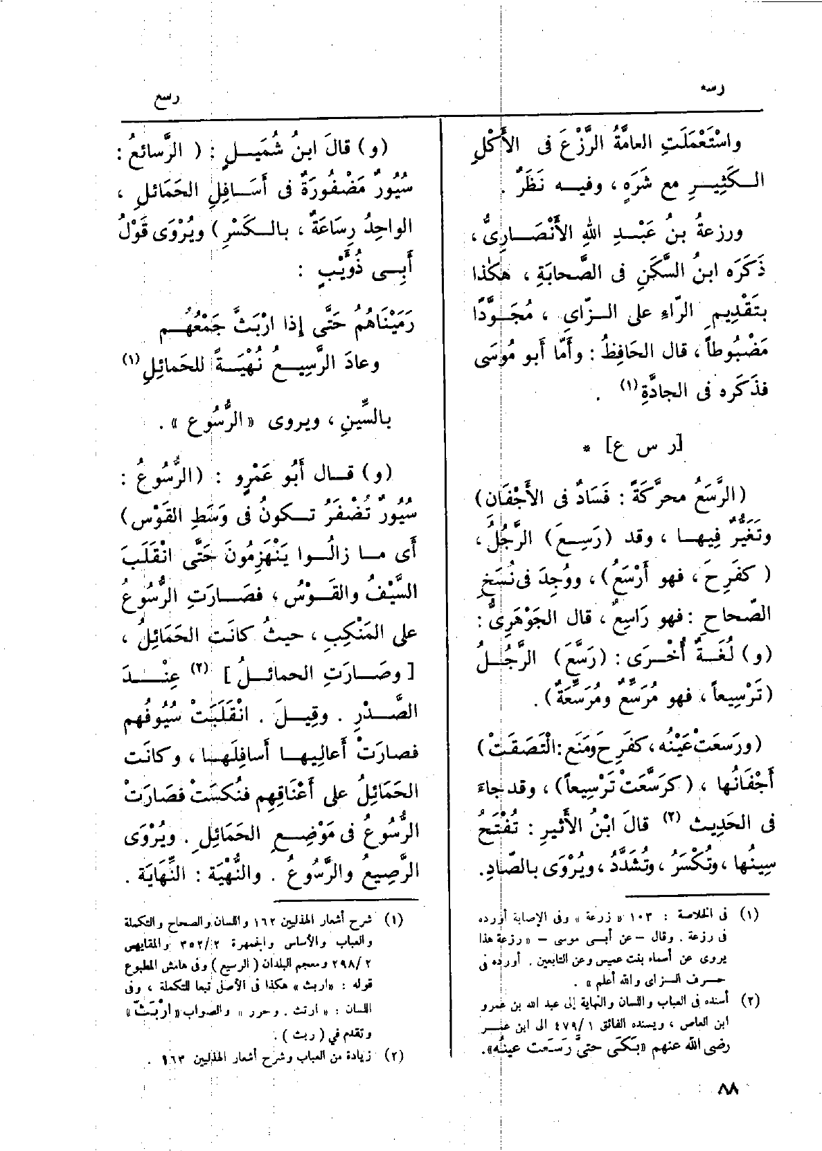 بالسِّين، ويروى الرُّسُوع. قَالَ أَبُو عمروٍ: الرُّسوع: سُيورٌ تُضفَرُ تكونُ فِي وسَطِ القَوس أَي مَا زَالُوا يَنْهَزِمون حَتَّى انْقلبَ السيفُ والقَوسُ، فصارتِ الرُّسوعُ على المَنْكِبِ، حيثُ كَانَت الحَمائل، وصارتِ الحمائلُ عندَ الصَّدرِ. وَقيل: انْقلبَتْ سيوفُهم فصارتْ الرُّسوعُ فِي مَوْضِعِ الحَمائل. ويُروى الرَّصيعُ والرَّسُوع. والنُّهْيَة: النِّهايَة.