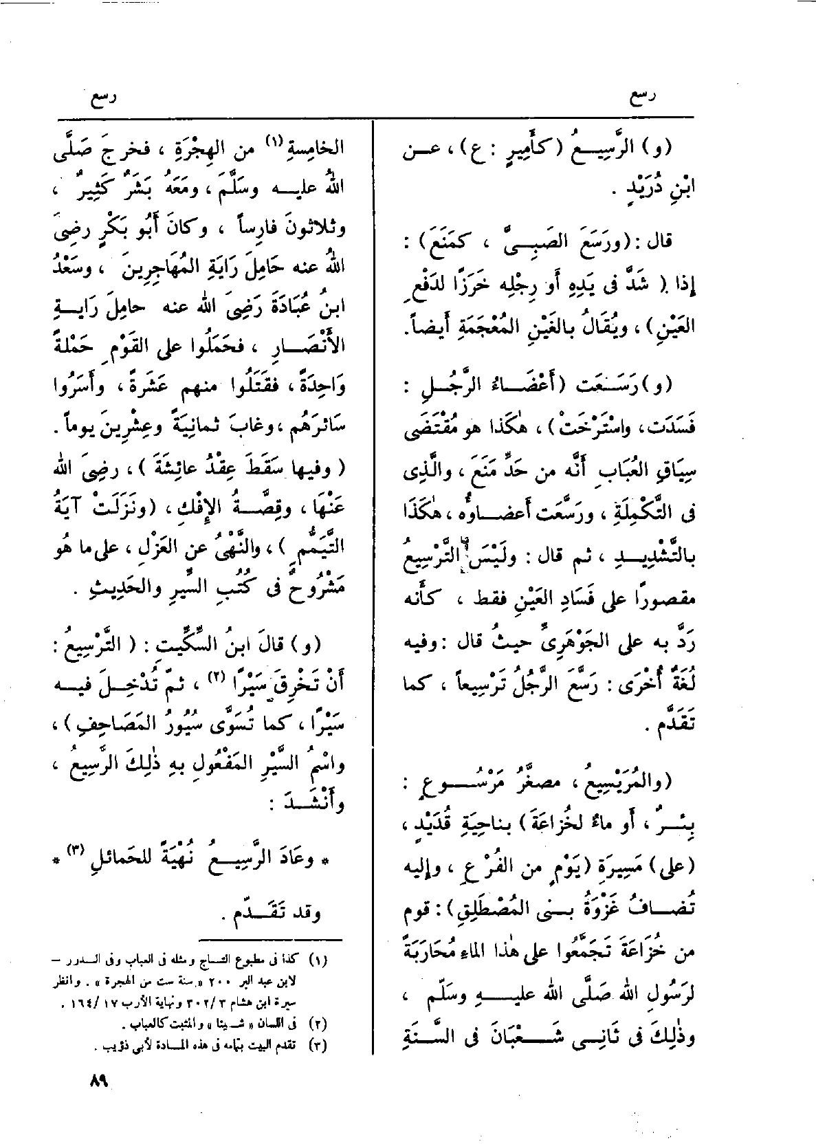 رايةِ المُهاجِرين، وسَعدُ بنُ عُبادَةَ رَضِيَ اللهُ عَنهُ حامِلَ رايةِ الْأَنْصَار، فحَمَلوا على القومِ حَمْلَةً وَاحِدَة، فَقَتَلوا مِنْهُم عَشَرَةً، وَأَسَروا سائرَهم، وغابَ ثمانِيَةً وعِشرينَ يَوْمَاً. وفيهَا سَقَطَ عِقْدُ عائِشَةَ رَضِيَ اللهُ عَنْهَا، وقِصّةُ الإفْك، ونَزَلَتْ آيةُ التَّيَمُّم، والنَّهْيُ عَن العَزْل، على مَا هُوَ مَشْرُوحٌ فِي كُتُبِ السِّيَر والْحَدِيث. قَالَ ابْن السِّكِّيت: التَّرْسيع: أَن تَخْرِقَ سَيْرَاً، ثمّ تُدخِلَ فِيهِ سَيْرَاً، كَمَا تُسَوِّي سُيورَ المَصاحِف، واسمُ السَّيْرِ المَفعولِ بِهِ ذَلِك الرَّسيع، وأنشدَ: وعادَ الرَّسيعُ نُهْيَةً للحَمائلِ وَقد تقدّم.