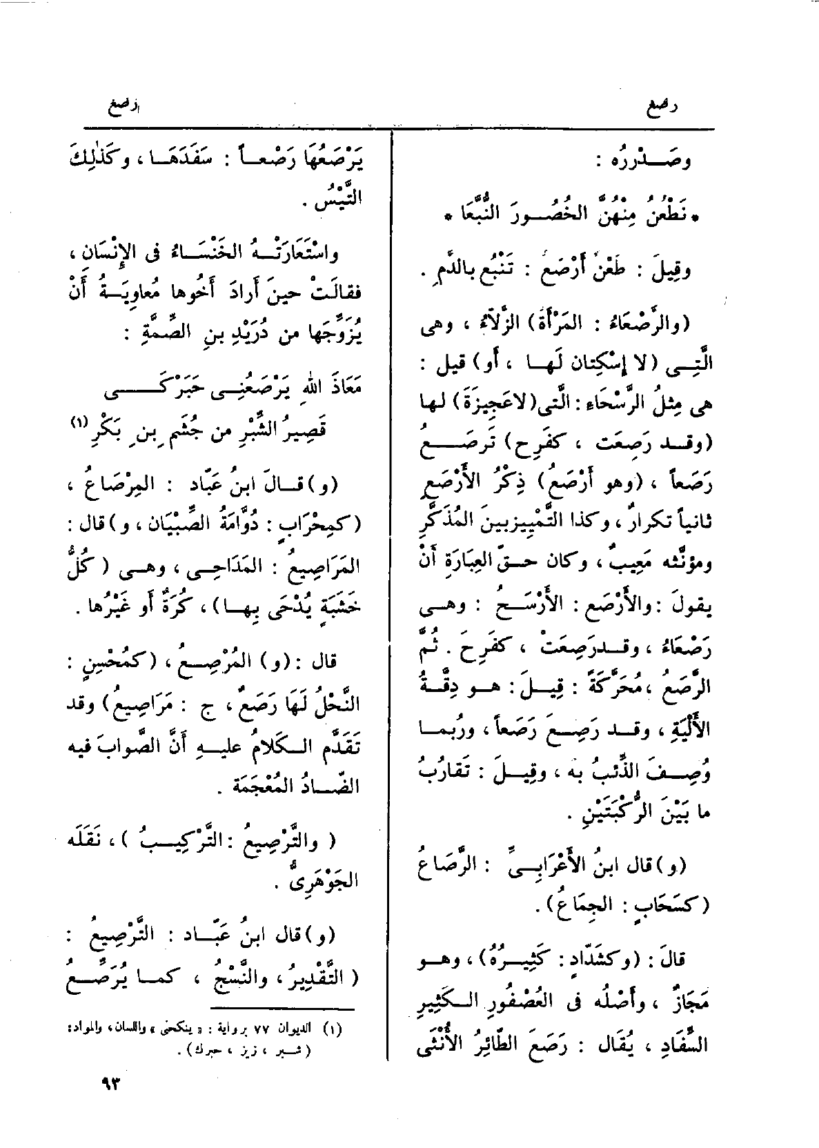 وصَدْرُه: نَطْعُنُ منهُنَّ الخُصُورَ النُّبَّعا وَقيل: طَعْنٌ أَرْصَعُ: تَنْبُعُ بالدَّمِ. والرَّصْعاءُ: المَرأَةُ الزَّلاّءُ، وَهِي الَّتِي لَا إسْكِتانَ لَهَا، أَو قيل: هِيَ مثلُ الرَّسْحاءِ: الَّتِي لَا عَجيزَةَ لَهَا وَقد رَصِعَت، كفَرِحَ تَرْصَعُ رَصَعاً، وَهُوَ أَرْصَعُ، ذِكْرُ الأَرْصَعِ ثَانِيًا تَكرارٌ، وَكَذَا التَّمْيِيز بَين المُذَكَّر ومُؤنَّثه مَعِيبٌ، وَكَانَ حَقّ العِبارَةِ أَن يَقولَ: والأَرْصَع: الأَرْسَحُ: وَهِي رَصْعاءُ، وَقد رَصِعَتْ، كفَرِحَ. ثمَّ الرَّصَعُ، مُحَرَّكَةً: قيل: هُوَ دِقَّةُ الأَلْيَةِ، وَقد رَصِعَ رَصَعاً، ورُبَّما وُصِفَ الذِّئبُ بِهِ، وَقيل: تَقارُبُ مَا بينَ الرُّكْبَتَيْنِ. قَالَ ابنُ الأَعرابيِّ: الرَّصاعُ كسَحابٍ: الجِماعُ. قَالَ: وكَشَدَّادٍ: كثيرُه، وَهُوَ مَجازٌ، وأَصلُه فِي العُصْفُورِ الكَثيرِ السِّفادِ، يُقال: رَصَعَ الطَّائرُ الأُنْثى يَرْصَعُها رَصْعاً: سَفَدَها، وكذلكَ التَّيْسُ. واسْتَعارَتْهُ الخَنساءُ فِي الإنسانِ، فَقَالَت حينَ أَرادَ أَخوها مُعاوِيَةُ أَن يُزَوِّجَها من دُرَيْدِ بنِ الصُّمَّةِ: