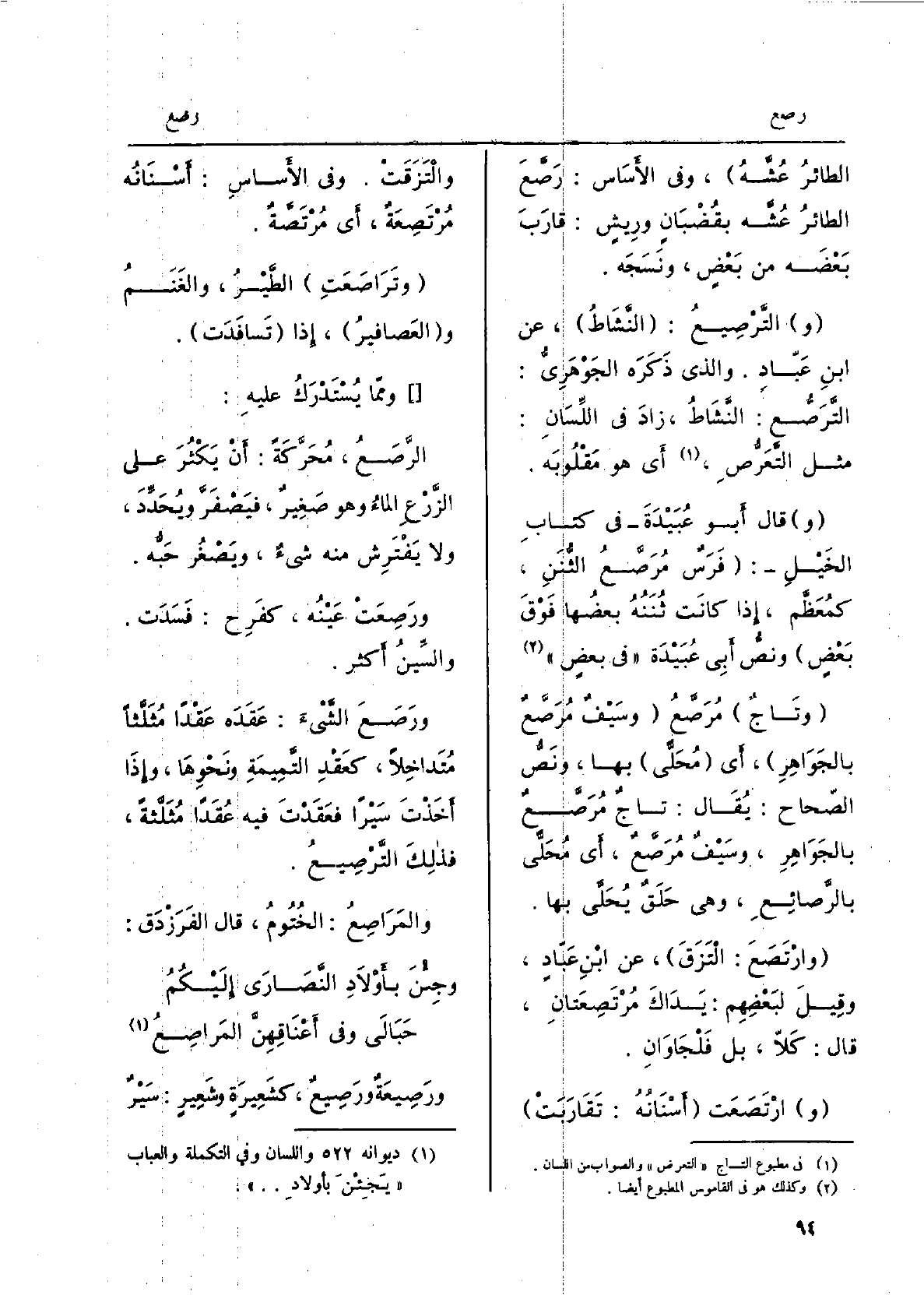 الطَّائرُ عُشَّهُ، وَفِي الأَساس: رَصَّعَ الطَّائرُ عُشَّه بقضبانٍ وريشٍ: قارَبَ بعضَه من بَعْضٍ ونَسَجَه. التَّرصيعُ: النَّشاطُ، عَن ابنِ عَبّاد. وَالَّذِي ذَكَرَه الجوهريُّ: التَّرَصُّع: النَّشاطُ، زادَ فِي اللسانِ: مثل التَّعَرُّصِ، أَي هُوَ مَقلُوبَه. قَالَ أَبو عُبيدةَ، فِي كتاب الْخَيل: فَرَسٌ مُرَصَّعُ الثُّنَنِ، كمُعَظَّم، إِذا كَانَت ثُنَنُه بعضُها فوقَ بعضٍ، ونَصُّ أَبي عُبيدة: فِي بعضِ. وتاجٌ مُرَصَّعُ، وسَيْفٌ مُرَصَّعٌ بالجَواهِرِ، أَي مُحَلَّى بالرَّصائعِ، وَهِي حَلَقٌ يُحَلَّى بهَا. وارْتَصَعَ: الْتَزَقَ، عَن ابنِ عبّاد، وقيلَ لبعضِهِم: يَداكَ مُرْتَصِعَتانِ، قَالَ: كّلاّ، بل فَلْجاوانِ. ارْتَصَعَتْ أَسْنانُه: تَقارَبَتْ والْتَزَقَتْ. وَفِي الأَساسِ: أَسْنانُه مُرْتَصِعَةٌ، أَي مُرْتَصَّةٌ.