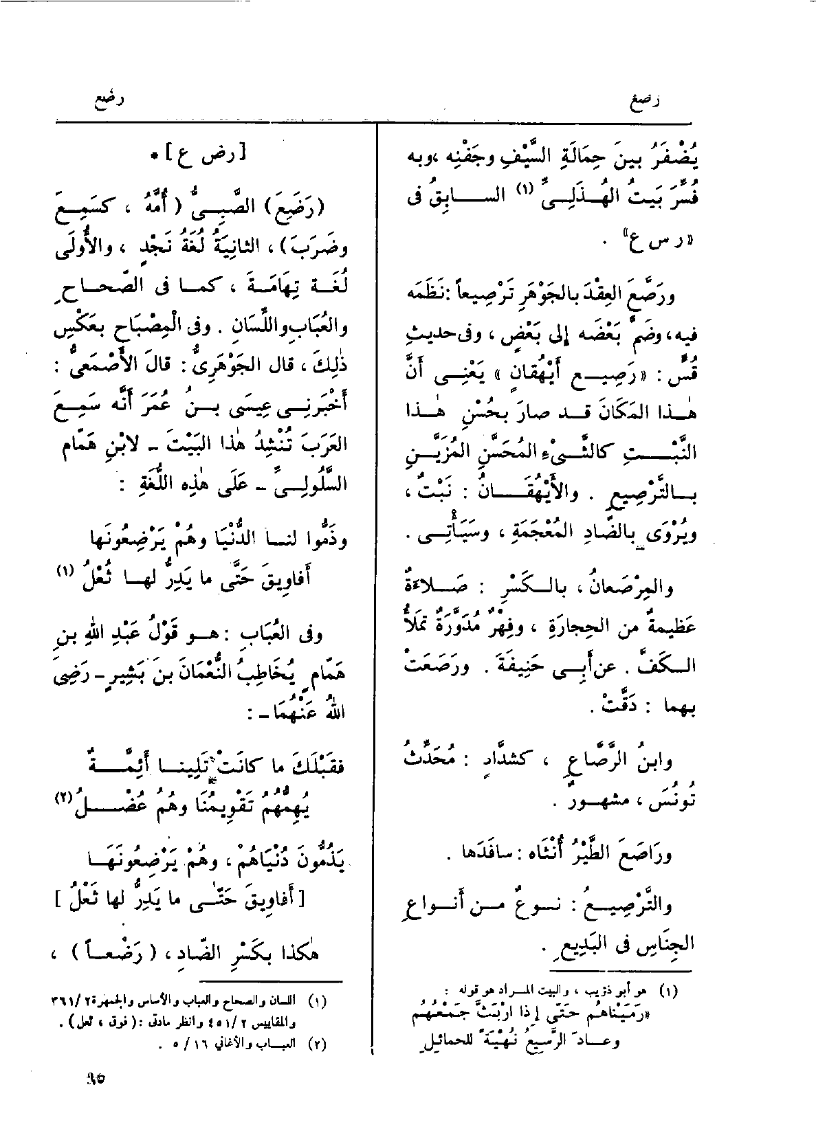 يُضْفَرُ بَين حِمَالةِ السيفِ وجَفْنِه، وَبِه فُسِّر بيتُ الهُذَلِيِّ السابقُ فِي رسع. ورَصَعَ العِقدَ بالجَوْهَرِ تَرْصِيعاً: نَظَمَه فِيهِ، وضَمَّ بَعْضَه إِلَى بعضٍ، وَفِي حديثِ قُسٍّ: رَصيع أَيْهُقان. يَعْنِي أنّ هَذَا المكانَ قد صارَ بحُسْنِ هَذَا النبتِ كالشيءِ المُحَسَّنِ المُزَيَّنِ بالتَّرْصيع. والأَيْهُقان: نَبْتٌ، ويُروى بالضادِ المُعجَمة، وَسَيَأْتِي. والمِرْصَعان، بالكَسْر: صَلاءَةٌ عظيمةٌ من الحِجارة، وفِهْرٌ مُدَوَّرَةٌ تملأُ الكَفَّ. عَن أبي حَنيفةَ. ورَصَعَتْ بهما: دَقَّتْ. وابنُ الرَّصَّاع، كشَدَّادٍ: مُحَدِّثُ تونُس، مَشْهُورٌ. وراصَعَ الطَّيرُ أُنْثاه: سافَدَها.