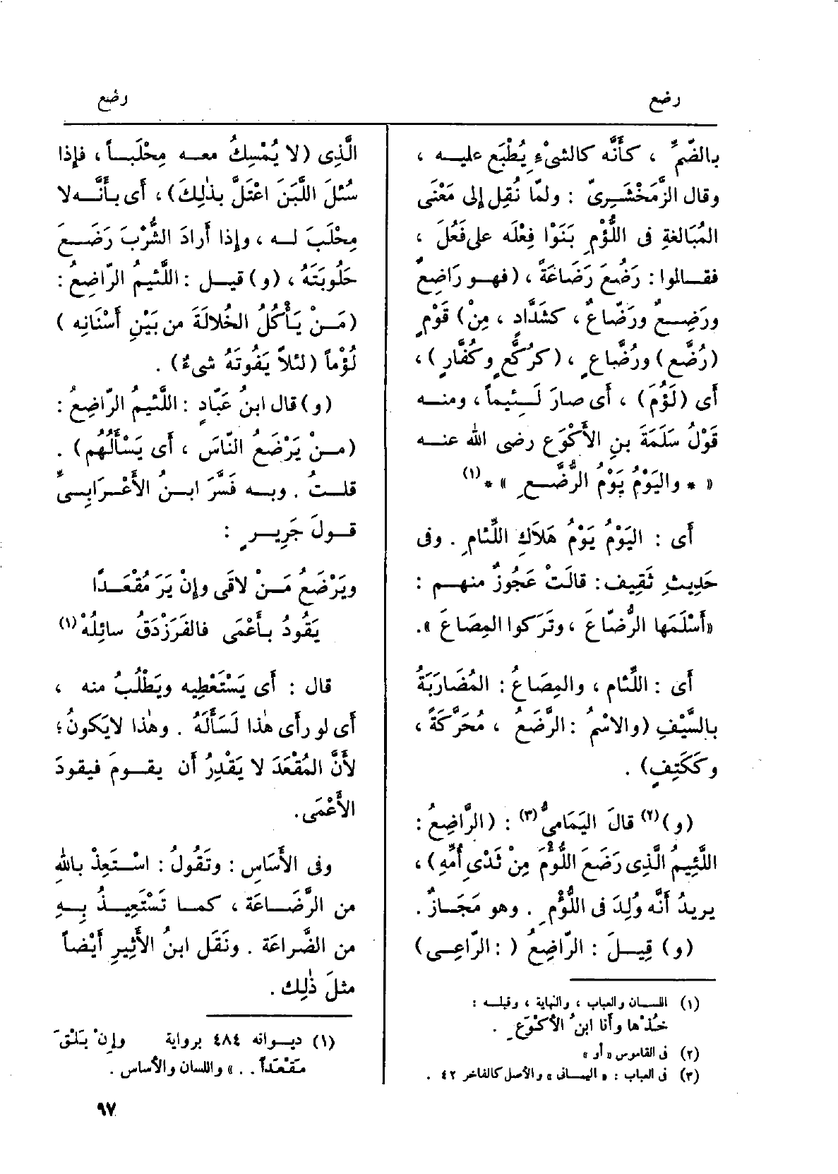 بالضَّمّ، كأنّه كالشيءِ يُطبَع عَلَيْهِ، وَقَالَ الزَّمَخْشَرِيّ: ولمّا نُقِلَ إِلَى معنى المُبالَغةِ فِي اللُّؤْمِ بَنَوْا فِعلَه على فَعُلَ، فَقَالُوا: رَضُعَ رَضاعَةً، فَهُوَ راضِعٌ ورَضِعٌ ورَضّاعٌ، كشَدَّادٍ، مِن قومٍ رُضَّعٍ ورُضَّاعٍ، كرُكَّعٍ وكُفَّارٍ، أَي لَؤُمَ، أَي صارَ لَئيماً، وَمِنْه قَوْلُ سَلَمَةَ بنِ الأَكْوَع رَضِي الله عَنهُ: واليومُ يَوْمُ الرُّضَّعِ أَي: اليومُ يَوْمُ هَلاكِ اللِّئامِ. وَفِي حديثِ ثَقيفٍ: قالتْ عجوزٌ مِنْهُم: أَسْلَمَها الرُّضَّاعَ، وَتركُوا المِصَاعَ. أَي اللِّئام، والمِصَاع: المُضارَبَةُ بالسيفِ والاسمُ: الرَّضَع، مُحرّكةً، وككَتِفٍ. قَالَ اليَماميُّ: الرَّاضِع: اللئيمُ الَّذِي رَضَعَ اللؤْمَ من ثَدْيِ أمِّه، يريدُ أنّه وُلِدَ فِي اللؤْم. وَهُوَ مَجاز.