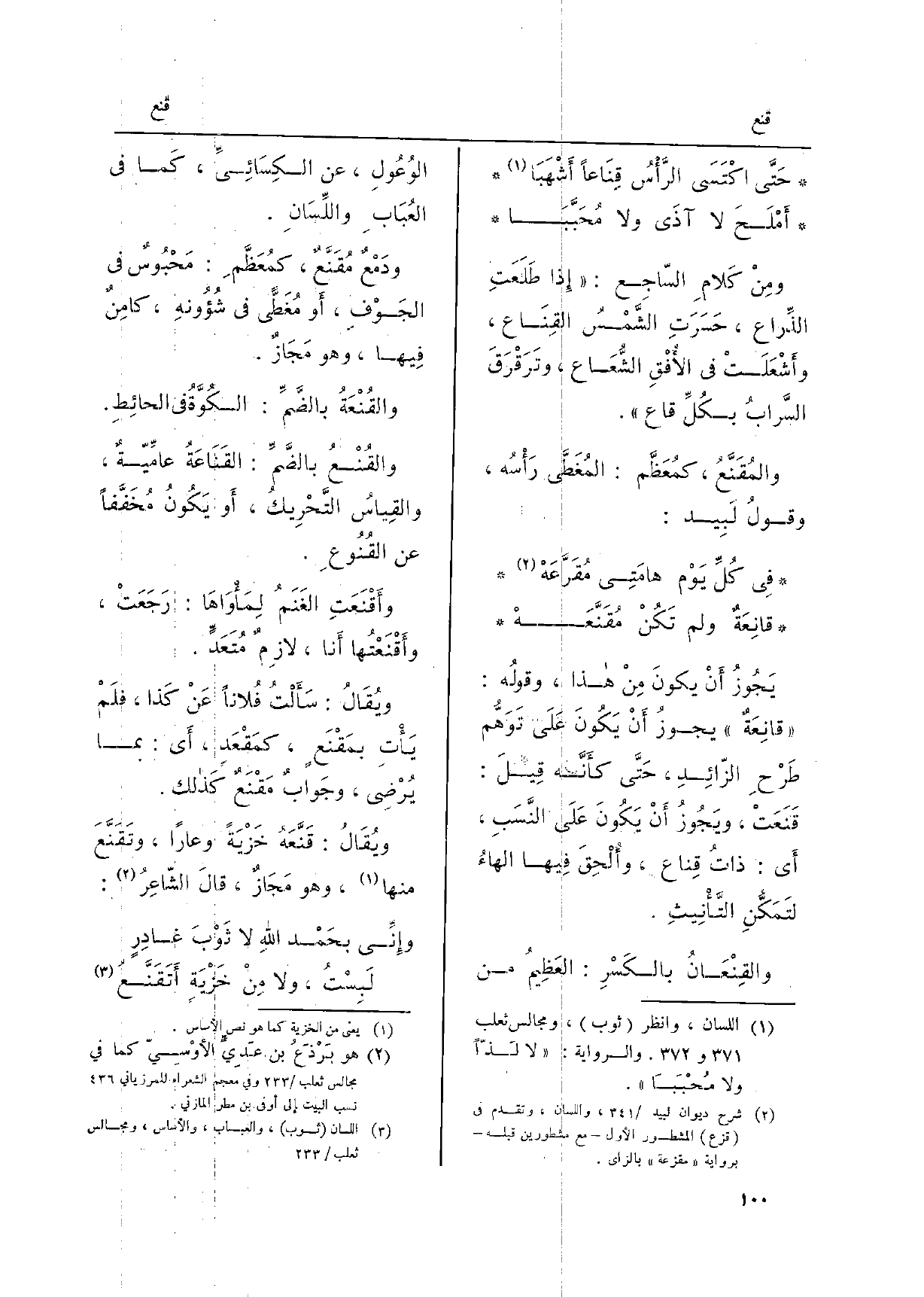 حَتّى اكْتَسَى الرَّأسُ قِناعَاً أشْهَبَا أمْلَحَ لَا آذَى وَلَا مُحَبَّبَا ومِنْ كَلامِ السّاجِعِ: إِذا طَلَعَتِ الذِّراع، حَسَرَتِ الشَّمْسُ القِنَاع، وأشْعَلَتْ فِي الأُفْقِ الشُّعَاع، وتَرَقْرَقَ السَّرابُ بكُلِّ قاع.