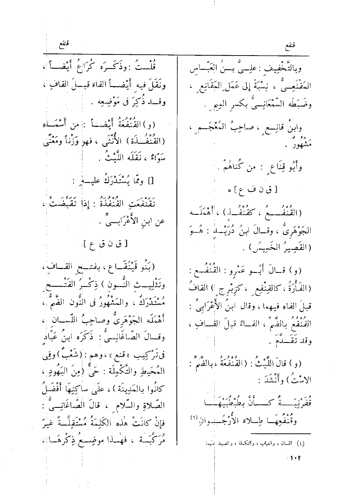 وقالَ أَبُو عَمْروٍ: القُنْفُع: الفَأرَةُ، كالقِنْفِعِ كزِبْرِجٍ، القافُ قبلَ الفاءِ فيهمَا، وَقَالَ ابنُ الأعْرَابِيّ الفُنْقُعُ بالضَّمِّ الفاءُ قبلَ القافِ، وَقد تقَدَّمَ.