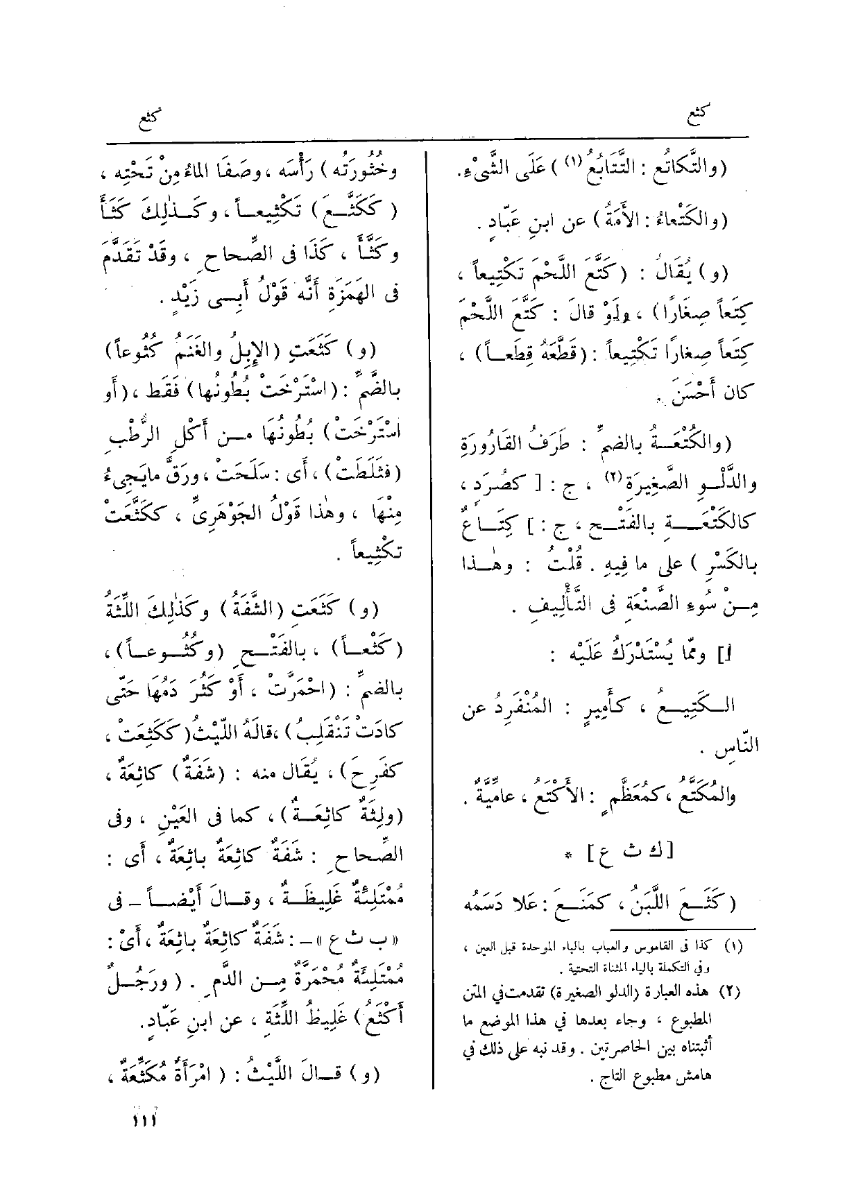 والكُتْعَةُ بالضَّمِّ طَرَفُ القَارُورَةِ والدَّلْوِ الصَّغِيرَةِ، ج: كصُرَد، كالكَتْعَةِ بالفَتْحِ، ج: كِتاعٌ بالكَسْرِ على مَا فيهِ.) قُلتُ: وَهَذَا مِنْ سُوءِ الصَّنْعَةِ فِي التَّأْلِيفِ.