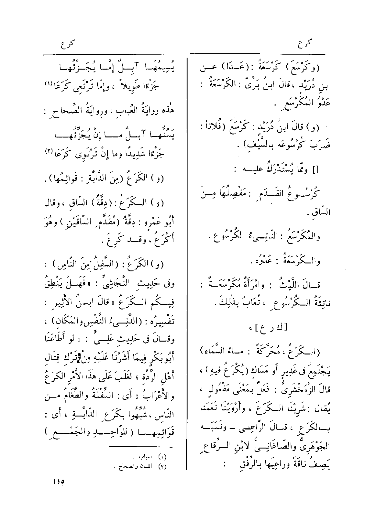 والكَرَعُ: السَّفِلُ مِنَ النّاسِ، وَفِي حَديثِ النَّجَاشِيِّ: فَهَلْ يَنْطِقُ فيكُم الكَرَعُ، قالَ ابنُ الأثِيرِ: تَفْسِيرُه: الدَّنِئُ النَّفسِ والمَكَانِ، وقالَ فِي حديثِ عَليٍّ: لَو أطَاعَنَا أَبُو بَكْرٍ فيمَا أشَرْنَا عَلَيْهِ منْ تَرْكِ قِتَالِ أهْلِ الرِّدَّةِ، لغَلَبَ على هَذَا الأمْرِ الكَرْعُ والأعْرَابُ، أَي: السِّفْلَةُ والطَّغَامُ من النّاسِ، شُبِّهُوا بكَرَعِ الدّابَّةِ، أَي: قَوائِمِها للوّاحِدِ والجَمْعِ