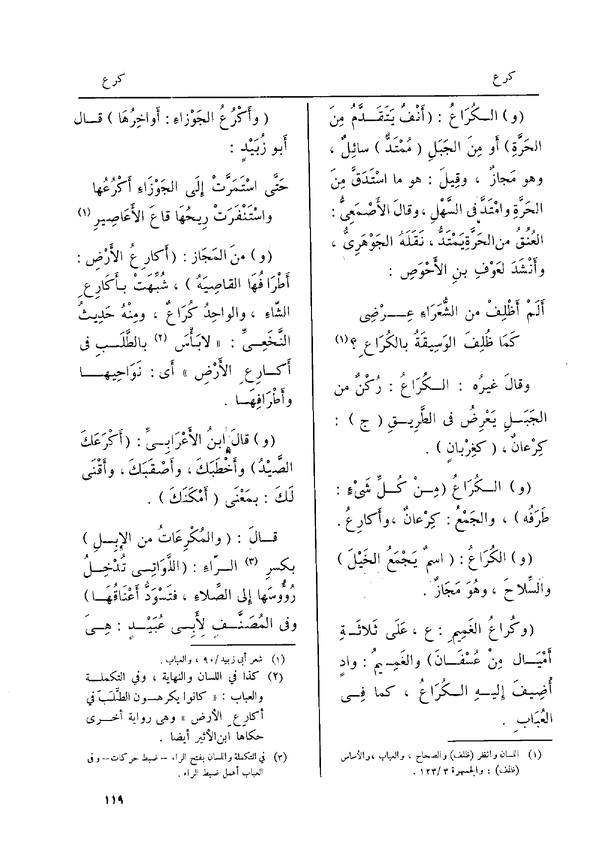 والكُرَاعُ مِنْ كُلِّ شَيءٍ: طَرَفُه، والجَمْعُ: كِرعانٌ، وأكارِعُ.
