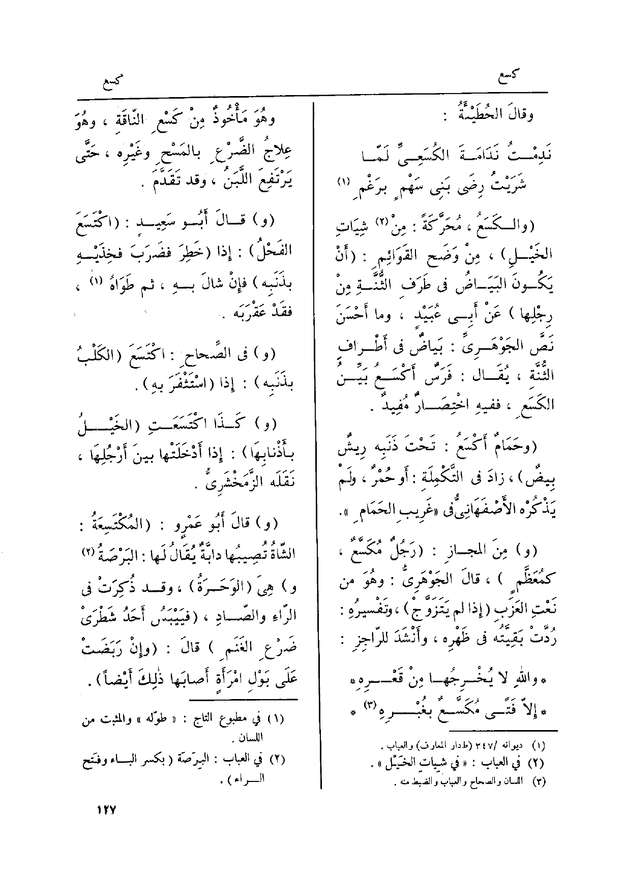 (نَدِمْتُ نَدامَةَ الكُسَعِيِّ لمّا ... شَرَيْتُ رِضَى بَنِي سَهْمٍ بَرغْمِ)