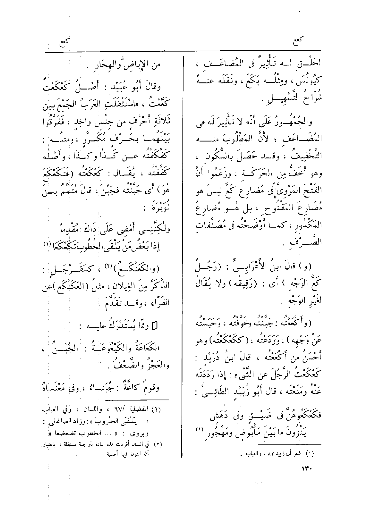 من الإِباضِ والهِجَارِ. وقالَ أَبُو عُبَيْد: أَصْل} كَعْكَعْتُ كَعَّعْتُ، فاسْتَثْقَلَتِ العَرَبُ الجَمْعَ بَين ثَلاثَةِ أَحْرُفٍ من جِنْسٍ واحِدٍ، فَقَرَّقُوا بَيْنَهُما بحَرْفٍ مُكَرَّرٍ، ومثلُه: كَفْكَفْتُه عَن كَذا وَكَذَا، وأَصْلهُ كَفَّفْتُه، يُقَال: َكعْكَعْتُه ( {فَتَكَعْكَعَ هُوَ) أَي جبنته فجَبُنَ، قالَ مُتَمِّمُ بن نُوَيْرَةَ:
