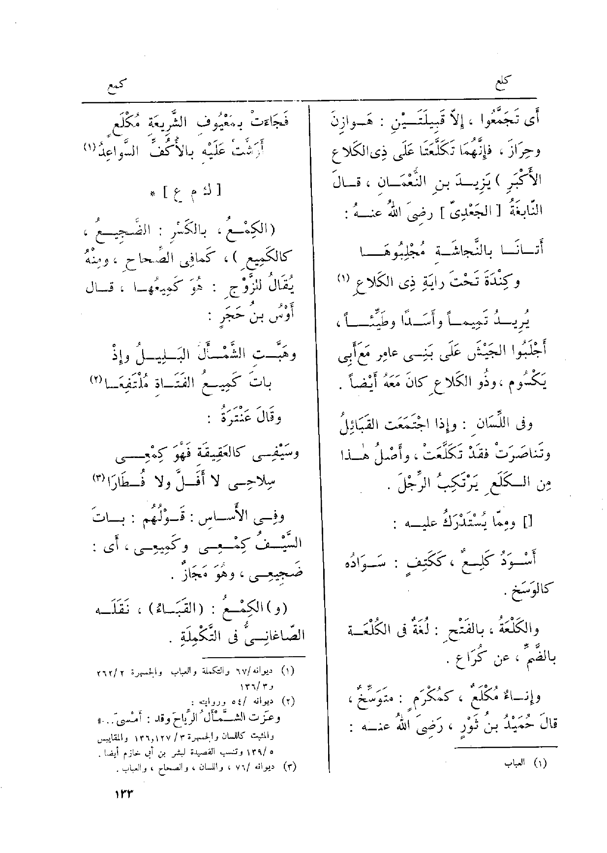 يُرِيدُ تَمِيماً وأَسَداً وطَيِّئاً، أَجْلَبُوا الجَيْشَ عَلَى بَنِي عامِر مَعَ أَبِي يَكْسُوم، وذُو الكَلاعِ كانَ مَعَهُ أَيْضَاً. وَفِي اللِّسَانِ: وإِذا اجْتَمَعَت القَبَائِلُ وتَناصَرَتْ فقَدْ تَكَلَّعَتْ، وأَصْلُ هَذَا مِن الكَلَعِ يَرْتَكِبُ الرِّجْلَ. [] ومِمّا يُسْتَدْرَكُ عَلَيْهِ: أَسْوَدُ كَلِعٌ، كَكَتِفٍ: سَوَادُه كالوَسَخ. والكَلْعَةُ، بالفَتْحِ: لُغَةٌ فِي الكُلْعَة بالضَّمِّ، عَن كُرَاع. وإِناءٌ مُكْلَعٌ، كمُكْرَمٍ: متَوَسِّخٌ، قالَ حُمَيْدُ بنُ ثَوْرٍ، رَضِيَ اللهُ عَنهُ: