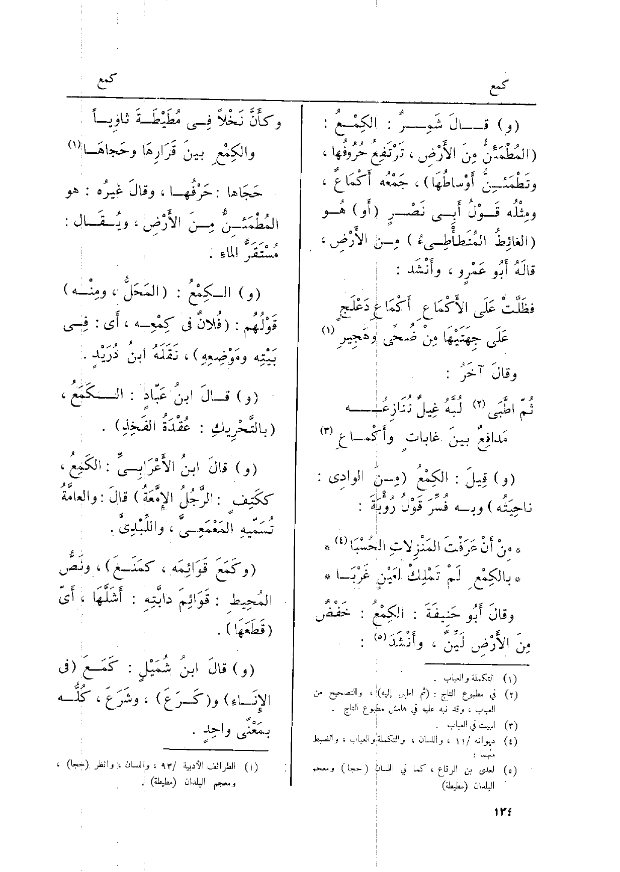 حَجَاها: حَرْفُها، وقالَ غيرُه: هُوَ المُطْمَئنُّ مِنَ الأَرْضِ، ويُقَال: مُسْتَقَرُّ الماءِ. (و) الكِمْعُ: (المَحَلُّ: ومِنْه) قَوْلُهُم: (فُلانٌ فِي كِمْعِه، أَي: فِي بَيْتِه ومَوْضِعِهِ) ، نَقَلَهُ ابنُ دُرَيْدٍ. (و) قالَ ابنُ عَبّادٍ: الكَمَعُ، (بالتَّحْرِيكِ: عُقْدَةُ الفَخِذِ) . قالَ ابنُ الأَعْرَابِيِّ: الكَمِعُ، ككَتِفٍ: الرَّجُلُ الإِمَّعَةُ) قالَ: والعامَّةُ تُسَمّيهِ المَعْمَعِيَّ، واللِّبْدِيَّ. (وكَمَعَ قَوَائِمَه، كمَنَعَ) ، ونَصُّ المُحِيطِ: قَوَائِمَ دابَّتِهِ: أَشَلَّهَا، أَيّ (قَطَعَهَا) . (و) قالَ ابنُ شُمَيْلٍ: كَمَعَ (فِي الإِنَاءِ) و (كَرَعَ) ، وشَرَعَ، كُلُّه بمَعْنًى واحِدٍ.