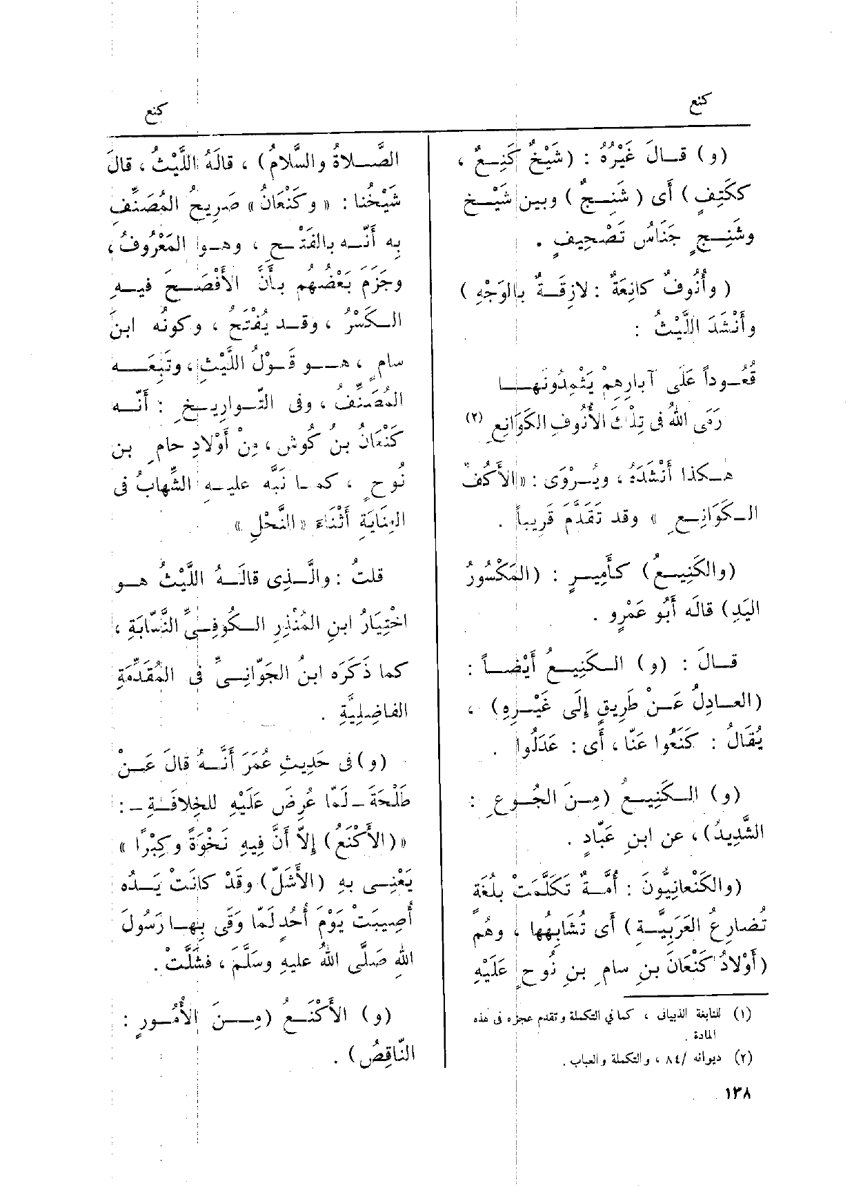 هَكَذَا أَنْشَدَهُ، ويُرْوَى: " الأَكُف الكَوَانِعِ " وَقد تَقَدَّمَ قَرِيباً. (والكَنِيعُ) كأَمِيرٍ: (المَكْسُورُ اليَدِ) قالَه أَبُو عَمْرٍ و. قالَ: (و) الكَنِيعُ أَيْضاً: (العادِلُ عَنْ طَرِيقٍ إلَى غَيْرِهِ) ، يُقَالُ: كَنَعُوا عَنّا، أَي: عَدَلُوا. (و) الكَنِيعُ (مِنَ الجُوعِ: الشَّدِيدُ) ، عَن ابنِ عَبّاد. (والكَنْعانِيُّونَ: أُمَّةٌ تَكَلَّمَتْ بلُغَةٍ تُضارِعُ العَرَبِيَّة) أَي تُشَابِهُها، وهُم (أَوْلادُ كَنْعَانَ بنِ سامِ بنِ نُوحِ عَلَيْهِ الصَّلاةُ والسَّلامُ) ، قالَهُ اللَّيْثُ، قالَ شَيْخُنا: " وكَنْعَانُ " صَرِيحُ المُصَنِّف بِه أَنّه بالفَتْحِ، وَهُوَ المَعْرُوفُ، وجَزَمَ بَعْضُهُم بأَنَّ الأَفْصَحَ فيهِ الكَسْرُ، وَقد يُفْتَحُ، وكونُه ابنَ سامٍ، هُوَ قَوْلُ اللَّيْثِ، وتَبِعَه المُصَنِّفُ، وَفِي التّوارِيخِ: أَنّه كَنْعَانُ بنُ كُوش، مِنْ أَوْلادِ حامِ بن نُوحٍ، كَمَا نَبَّه عليهِ الشِّهابُ فِي العِنَايَةِ أَثْنَاءَ " النَّحْلِ " قلتُ: والَّذِي قالَهُ اللَّيْثُ هُوَ اخْتِيَارُ ابنِ المُنْذِرِ الكُوفِيِّ النَّسّابَةِ، كَمَا ذَكَرَه ابنُ الجَوّانِيِّ فِي المُقَدِّمَةِ الفاضِلِيَّةِ. (و) فِي حَدِيثِ عُمَرَ أَنَّهُ قالَ عَنْ طَلْحَةَ - لَمّا عُرِضَ عَلَيْهِ للخِلافَةِ -: " (الأَكْنَعُ) إلاّ أَنَّ فِيهِ نَخْوَةً وكِبْراً ". يَعْنِي بهِ (الأَشَلّ) وقَدْ كانَتْ يَدُه أَصِيبَتْ يَوْمَ أُحُدِ لَمّا وَقَى بِها رَسُولَ اللهِ