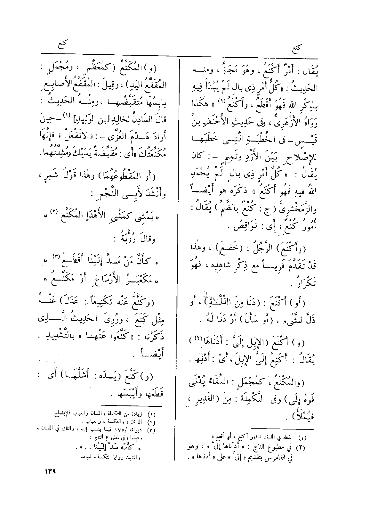 يُقَال: أَمْرٌ أَكْنَعُ، وهُوَ مَجَازٌ، وَمِنْه الحَدِيثُ: " كُلُّ أَمْرٍ ذِي بَال لَمْ يُبْدَأْ فِيهِ بذِكْرِ الله فَهُوَ أَقْطَعُ، وأَكْنَعُ " هكَذا رَوَاهُ الأَزْهَرِيُّ، وَفِي حَدِيثِ الأَحْنَفِ بنَّ قَيْسٍ - فِي الخُطْبَةِ الَّتِي خَطَبَها للإِصْلاحِ بَيْنَ الأَزْدِ وتَمِيمٍ -: كَانَ يُقَالُ: " كُلُّ أَمْرٍ ذِي بالٍ لَمْ يُحْمَدِ اللهُ فيهِ فَهُو أَكْنَعُ " ذكَرَه هُوَ أَيْضَاً والزَّمَخْشرِيُّ (ج: كُنْعٌ بالضَّمِّ) يُقَالُ: أُمُورٌ كُنْعٌ، أَي: نَوَاقِصُ. (وأَكْنَعَ) الرَّجُلُ: (خَضعَ) ، وَهَذَا قَدْ تَقَدَّمَ قَرِيباً مَعَ ذِكْرِ شاهِدِه، فهُوَ تَكْرَارٌ. (أَو) أَكْنَعَ: (دَنَا مِنَ الذِّلَّة) ، أَو ذَلَّ للشَّيءِ، (أَو سَأَلَ) أَوْ دَنَا لَهُ. (و) أَكْنَعَ (الإِبِل إلَىَّ: أَدْنَاهَا) يُقَالُ: أَكْنِعْ إِلَى الإِبِلَ، أَيْ: أَدْنِها. (والمُكْنَعُ، كمُجْمَلٍ: السِّقَاءُ يُدْنَى فُوهُ إِلَى) وَفِي التَّكْمِلَة: مِنَ (الغَدِيرِ، فيُمْلَأُ) . (و) المُكَنَّعُ (كمُعَظَّمٍ، ومُجْمَلٍ: المُقَفَّعُ اليَدِ) ، وقِيلَ: المُقَفَّعُ الأَصابِعِ يابِسُهَا مُتقَبِّضُها، ومِنْهُ الحَدِيثُ: قالَ السّادِنُ لخالِدِ [بن الوَلِيدِ]- حِينَ أَرادَ هَدْمَ العُزَّى -: " لَا تَفْعَلْ؛ فإِنَّهَا مُكَنِّعَتُك " أَي: مُقَبِّضَةٌ يَدَيْكَ ومُشِلَّتُهُما. (أَو المَقْطُوعُهُمَا) وَهَذَا قَوْلُ شَمِرٍ، وأَنْشَدَ لأَبِي النَّجْمِ: