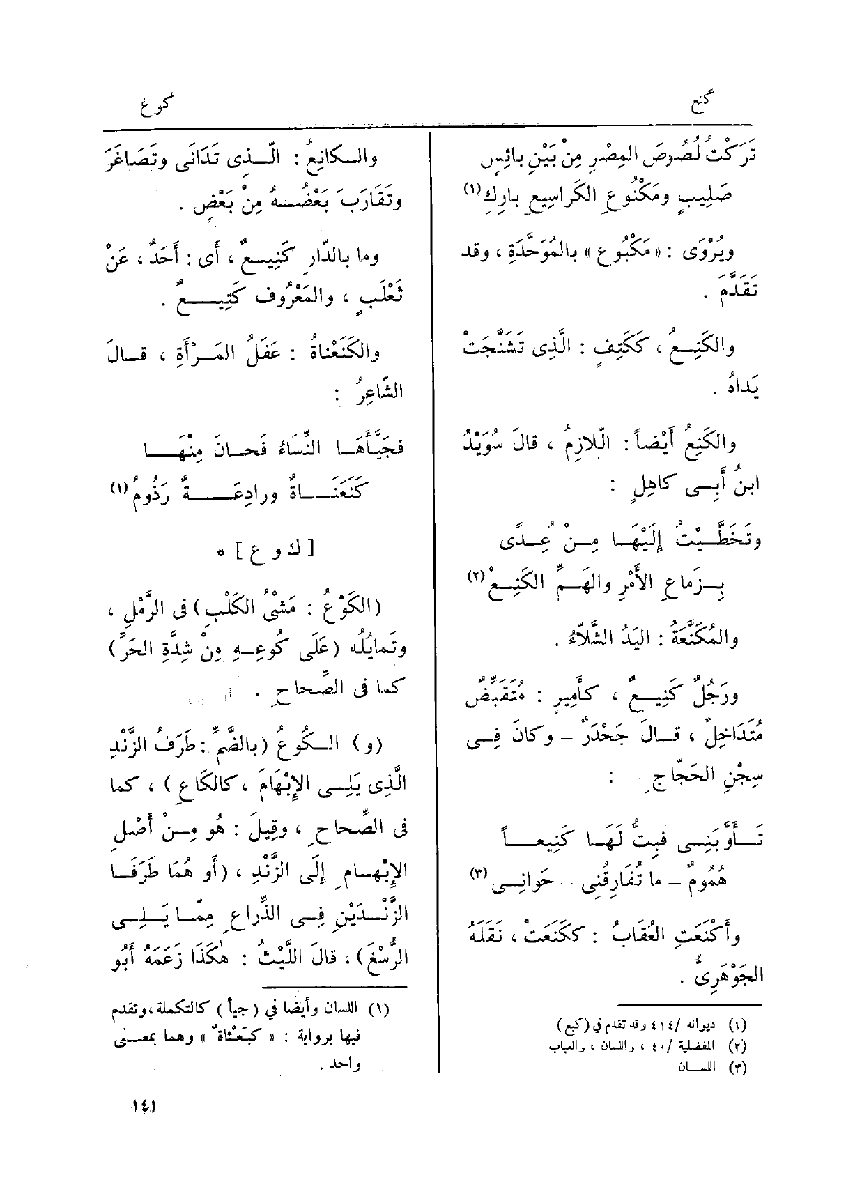 (تَرَكْتُ لُصُوصَ المِصْرِ مِنْ بَيْنِ بائِسٍ ... صَلِيبٍ ومَكْنُوعِ الكَراسِيعِ بارِكٍ)