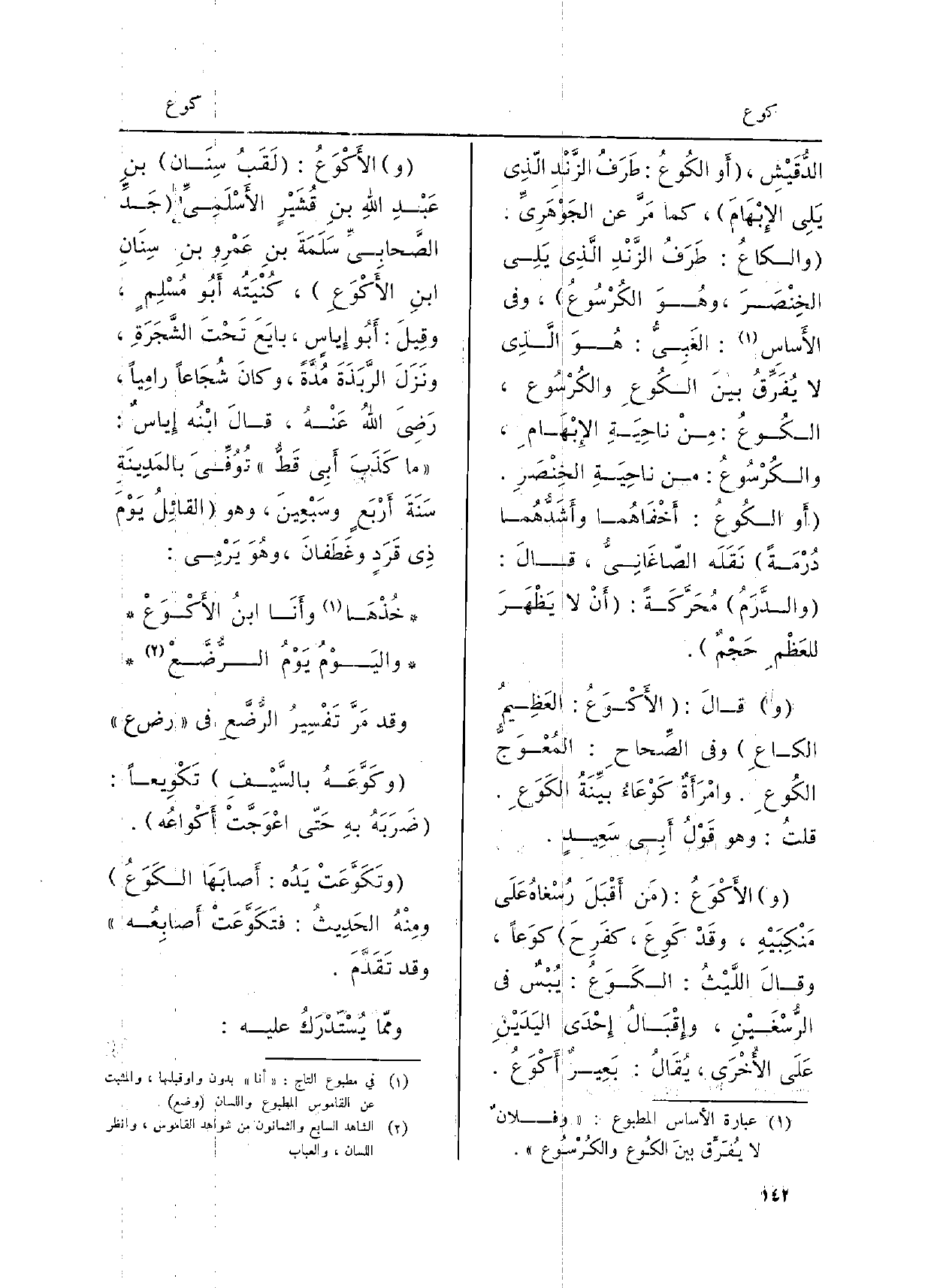 الدُّقَيْشِ، (أَو الكُوعُ: طَرَفُ الزَّنْدِ الّذِي يَلِي الإِبْهَامَ) ، كَمَا مَرَّ عَن الجَوْهَرِيِّ. ( {والكاعُ: طَرَفُ الزَّنْدِ الَّذِي يَلِي الخِنْصَرَ، وهَوَ الكُرْسُوعُ) ، وَفِي الأَسِاس: الغَبِىُّ: هُوَ الَّذِي لَا يُفَرِّقُ بينَ} الكُوعِ والكُرْسُوع، الكُوعُ: مِنْ ناحِيَة الإِبْهَامِ، والكُرْسُوعُ: من ناحِيَةِ الخِنْصَرِ. (أَو الكُوعُ: أَخْفَاهُما وأَشَدُّهُما دُرْمَةً) نَقَلَه الصّاغَانِي، قالَ: (والدَّرَمُ) مُحَرَّكَةً: (أًنْ لَا يَظْهَرَ للعَظْمِ حَجْمٌ) . (و) قالَ: (الأَكْوَعُ: العَظِيمُ الكاعِ) وَفِي الصِّحاحِ: المُعْوَجُّ الكُوعِ. وامْرَأَةٌ {كَوْعَاءُ بيِّنًةُ الكَوَعِ. قلتُ: وَهُوَ قَوْلُ أَبِي سَعِيد. (و) } الأَكْوَعُ: (مَن أَقْبَلَ رُسْغاهُ عَلَى مَنْكَبَيْهِ، وقَدْ {كَوِعَ، كفَرِحَ) } كوَعاً، وقالَ اللَّيْثُ: {الكَوَعُ: يُبْسٌ فِي الرُّسْغَيْنَ، وإِقْبَالُ إِحْدَى اليَدَيْنِ عَلَى الأُخْرَى، يُقَالُ: بَعِيرٌ} أَكْوَعُ. (و) الأَكْوَعُ: (لَقَبُ سِنَان) بنِ عَبْدِ اللهِ بنِ قُشَيْرٍ الأَسْلَمِيِّ (جَدِّ الصَّحابِيِّ سَلَمَة بنِ عَمْرِو بنِ سِنَانِ ابنٍ الأَكْوَعِ) ، كُنْيَتُه أَبُو مُسْلِم، وقِيلَ: أَبُو إِياس، بايَعَ تَحْتَ الشَّجَرَةِ، ونَزَلَ الرَّبَذَةَ مُدَّةً، وكانَ شُجَاعاً رامِياً، رَضِيَ اللهُ عَنْهُ، قالَ ابْنُه إِياسٌ: " مَا كَذَبَ أَبِي قَطُّ " تُوُفِّيَ بالمَدِينَة سَنَةَ أَرْبَعٍ وسَبْعِينَ، وَهُوَ (القائِلُ يَوْمَ ذِي قَرَدٍ وغَطَفانَ، وهُوَ يَرْمِي: