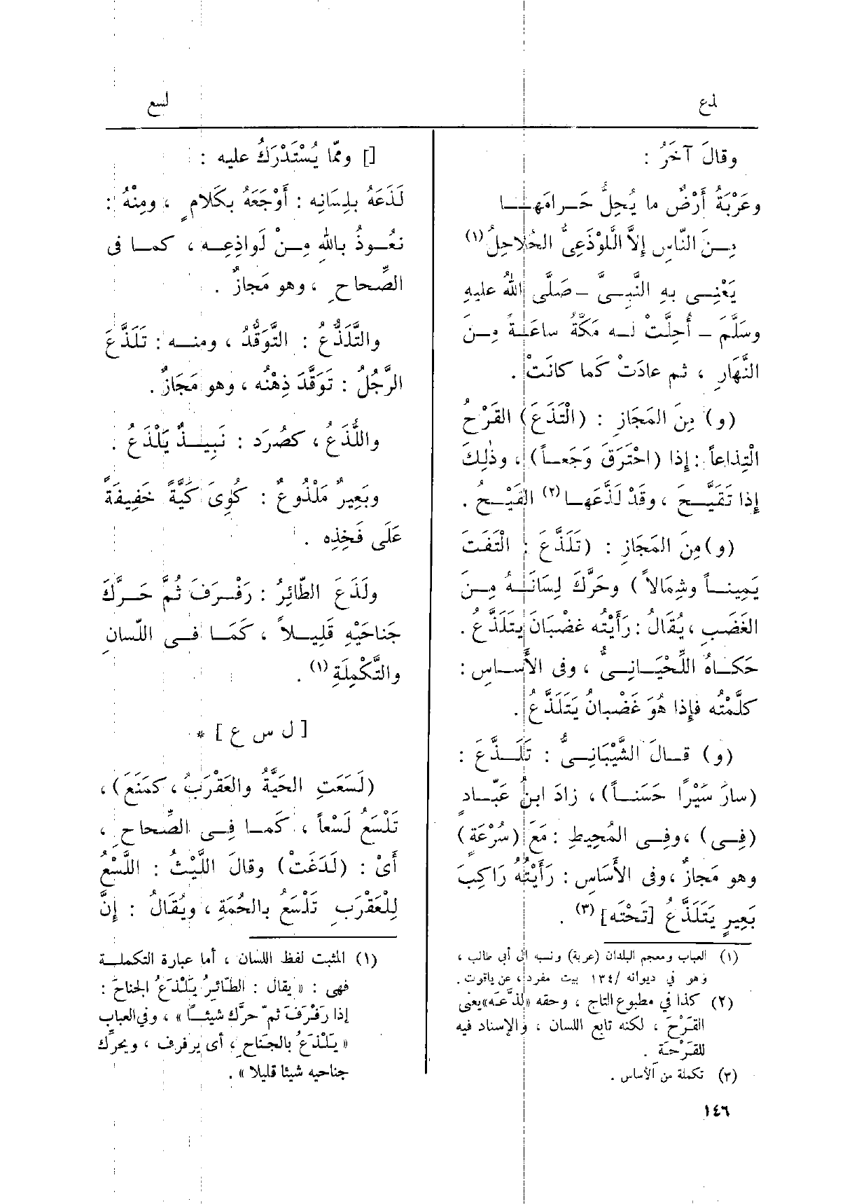 وقالَ الشَّيْبَانِيُّ: تَلَذَّعَ: سارَ سيْراتً حَسَناً، زادَ ابنُ عَبّادٍ فِي، وَفِي المُحِيطِ: مَعَ سُرْعَةٍ وَهُوَ مَجازٌ، وَفِي الأسَاسِ: رَأيْتُهُ رَاكِبَ بَعِيرٍ يَتَلذَّعُ تَحْتَه.
