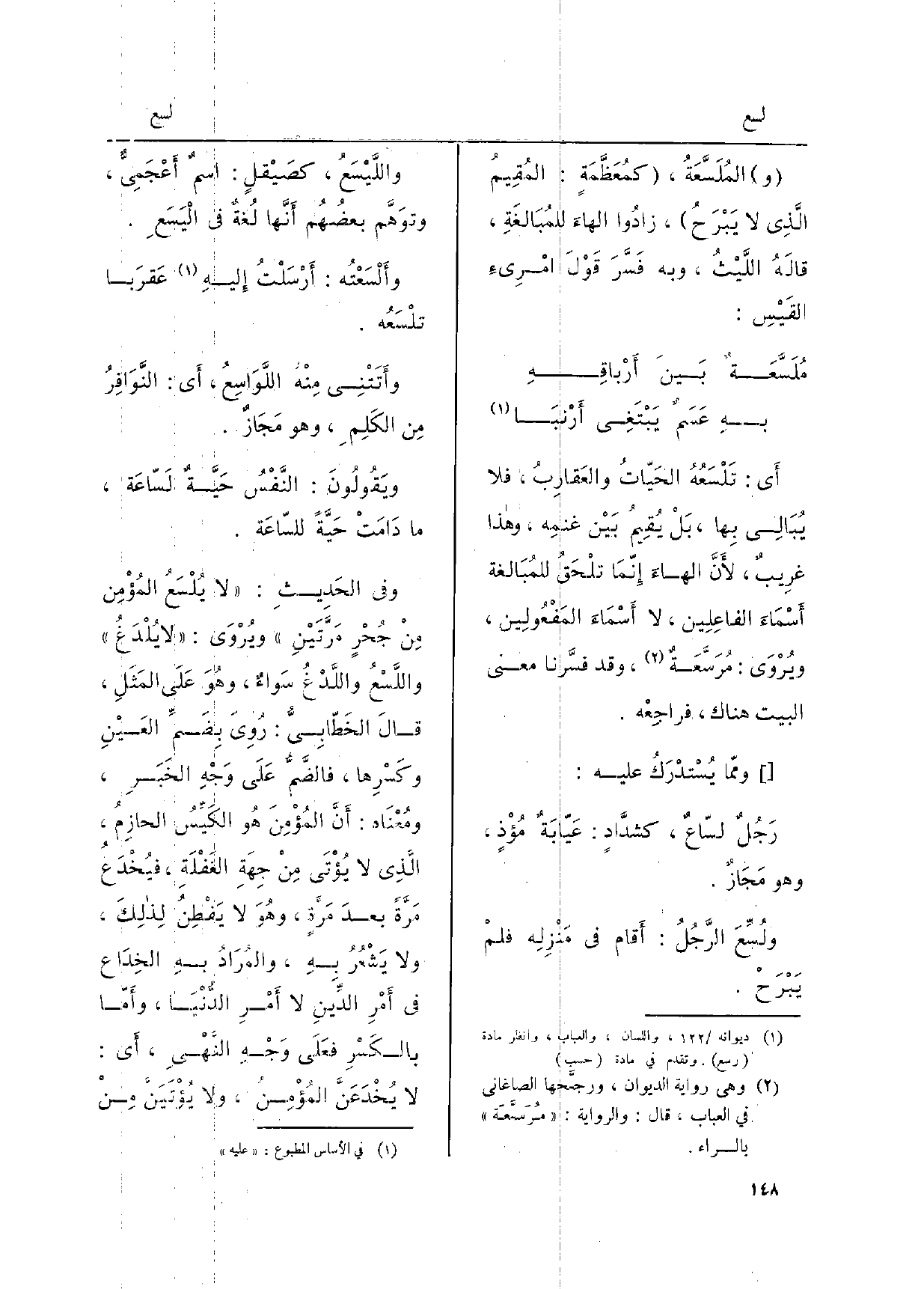 والمُلَسَّعَةُ، كمُعَظَّمَةٍ: المُقِيمُ الّذِي لَا يَبْرَحُ، زادُوا الهاءَ للمُبَالغَةِ، قالَهُ اللَّيْثُ، وَبِه فَسَّرَ قَوْلَ امْرئ القَيسِ: