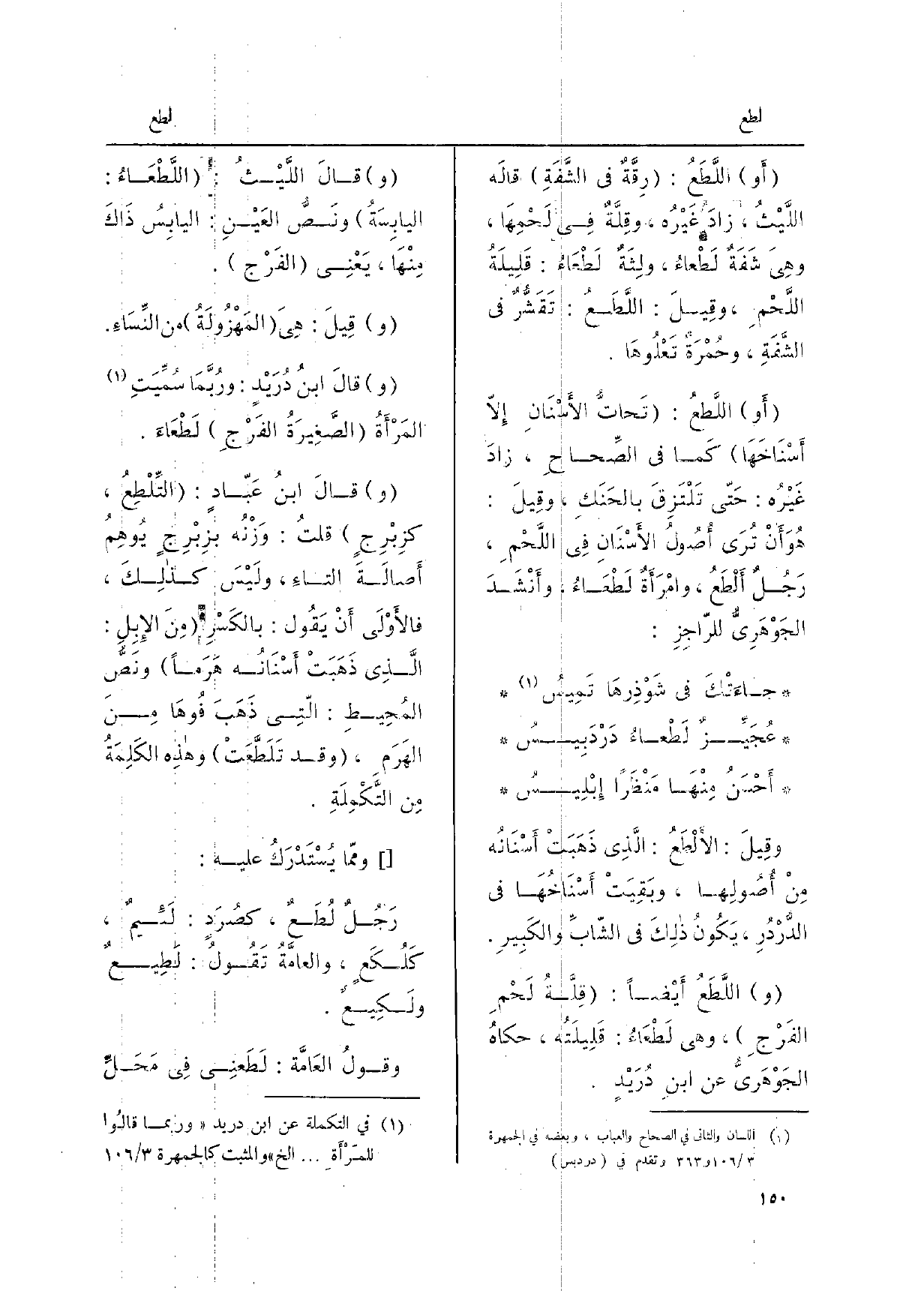 أَو اللَّطَعُ: تَحاتُّ الأسْنَانِ إلاّ أسْنَاخَهَا كَمَا فِي الصِّحاحِ زادَ غَيْرُه: حَتّى تَلْتَزِقَ بالحَنَكِ، وقِيلَ: هُوَ أنْ تُرَى أُصُولُ الأسْنَانِ فِي اللَّحْمِ، رَجُلٌ ألْطَعُ، وامْرَأَةٌ لَطْعَاءُ، وأنْشَدَ الجَوْهَرِيُّ للرّاجِزِ: جاءَتْكَ فِي شَوْذِرَها تَمِيسُ عُجِيِّزٌ لَطْعاءُ دَرْدَبِيسُ أحْسَنُ مِنْهَا مَنْظراً إبْلِيسُ وقِيلَ: الألْطَعُ: الّذِي ذَهَبَتْ أسْنَانُه منْ أُصُولِها، وبَقِيَتْ أسْنَاخُهَا فِي الدُّرْدُرِ، يكُونُ ذلكَ فِي الشّابِّ والكَبيرِ.