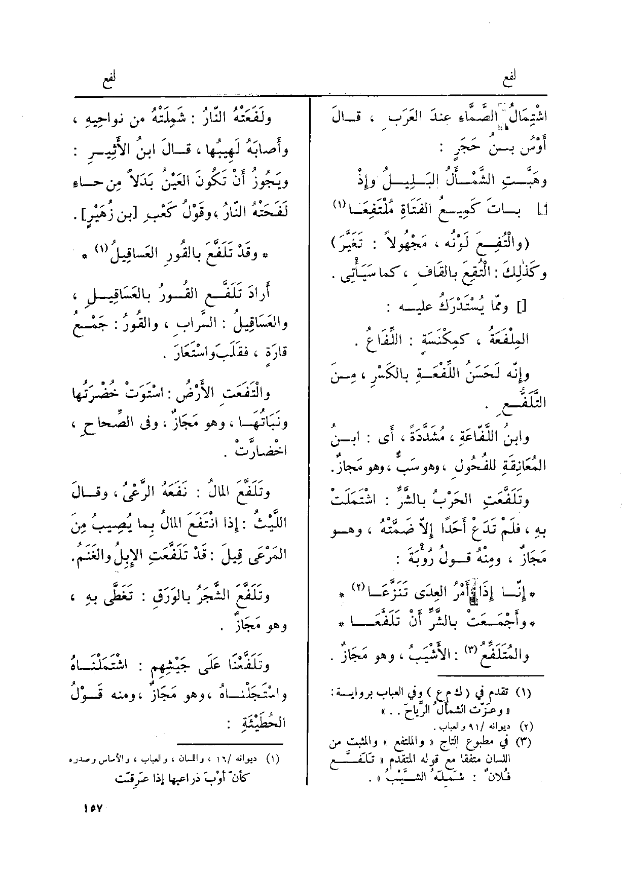 ولَفَعَتْهُ النّارُ: شَمِلَتْهُ من نواحِيهِ، وأصابَهُ لَهِيبُها، قالَ ابنُ الأثِيرِ: ويجُوزُ أنْ تَكُونَ العَيْنُ بَدَلاً من حاءِ لَفَحَتْهُ النّارُ، وقَوْلُ كَعْبِ بن زُهَيرٍ.
