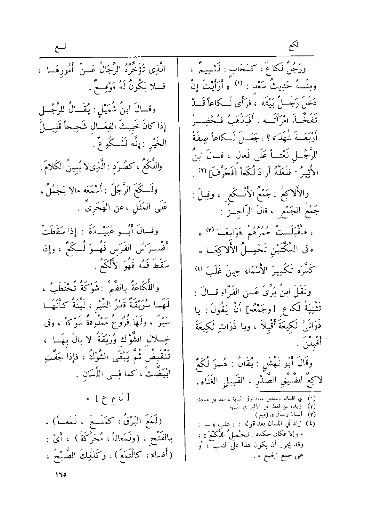 ورَجُلٌ لَكاعٌ، كسَحَابٍ: لَئِيمٌ، ومِنْهُ حَديثُ سَعْدٍ: أرَأيْتَ إنْ دَخَلَ رَجُلٌ بَيْتَه، فَرَأى لَكاعاً قَدْ تَفَخَّذَ امْرَأتَه، أفَيَذْهَبُ فيُحْضِرُ أرْبَعَةَ شُهَدَاءَ جَعَلَ لَكاعاً صِفةً للرَّجُلِ نَعْتاً على فَعالٍ، قالَ ابنُ الأثِيرُ: فلَعَلَّهُ أرادَ لُكَعاً فَحَرَّفَ.