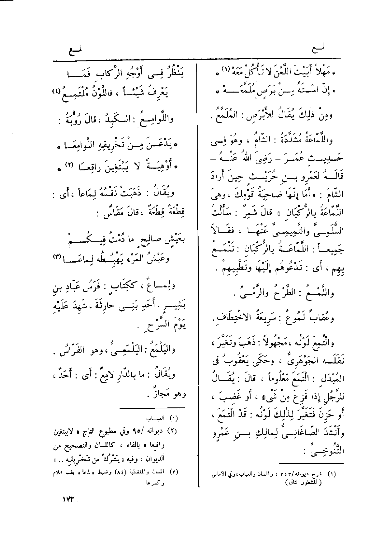 وإنّ اسْتَهُ منْ بَرَصٍ مُلَمَّعَهْ واللَّمّاعَةُ مُشَدَّدَةً: الشّامُ، وَهُوَ فِي حديثِ عمَرَ رضيَ اللهُ عَنهُ قالَهُ لعَمْرو بنِ حُرَيْثٍ حينَ أرادَ الشامَ: أما إنّهَا ضاحِيَةُ قَوْمِكَ، وَهِي اللَّمّاعَةُ بالرُّكْبانِ قالَ شَمِرٌ: سألْتَ السُّلَمِيَّ والتَّميمِيَّ عنْهَا، فَقَالَا جَمِيعاً: اللَّمّاعَةُ بالرُّكْبانِ: تَلْمَعُ بهِم، أَي: تَدْعُوهُم إليْهَا وتَطَّبِيهمْ.