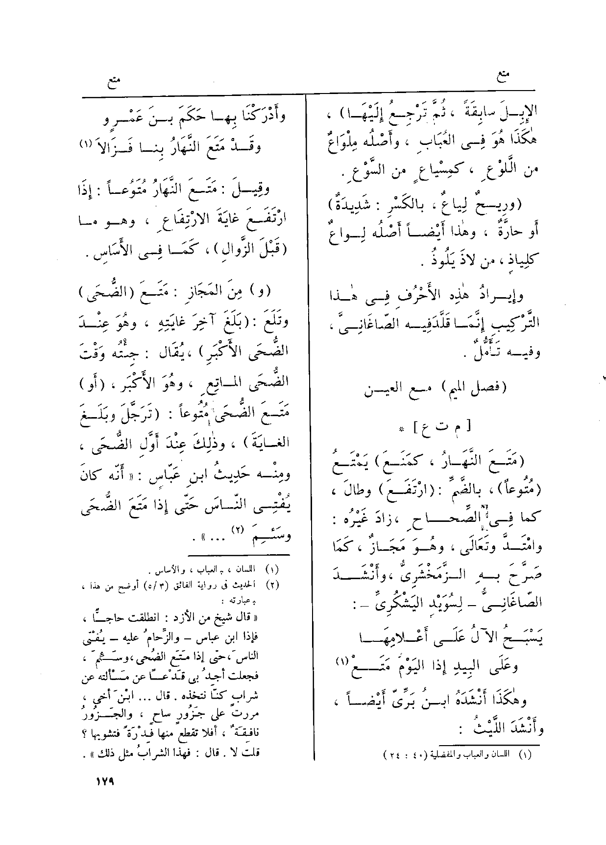 وَمن المَجَازِ مَتَعَ الضُّحَى وتَلَعَ: بَلَغ آخِرَ غايتهِ، وهوَ عِنْدَ الضُّحَى الأكْبَرِ، يُقَالُ جِئْتُه وقْتَ الضُّحَى الماتِعِ، وهوَ الأكْبَر، أَو مَتَعَ الضُّحَى مُتُوعاً: تَرَجَّلَ وبَلَغ الغايَةَ، وذلكَ عندَ أوّلِ الضُّحَى، وَمِنْه حَديثُ ابنِ عَبّاسٍ: أنّه كانَ يُفْتِي النّاسَ حَتّى إِذا مَتَعَ الضُّحَى وسئِمَ. .