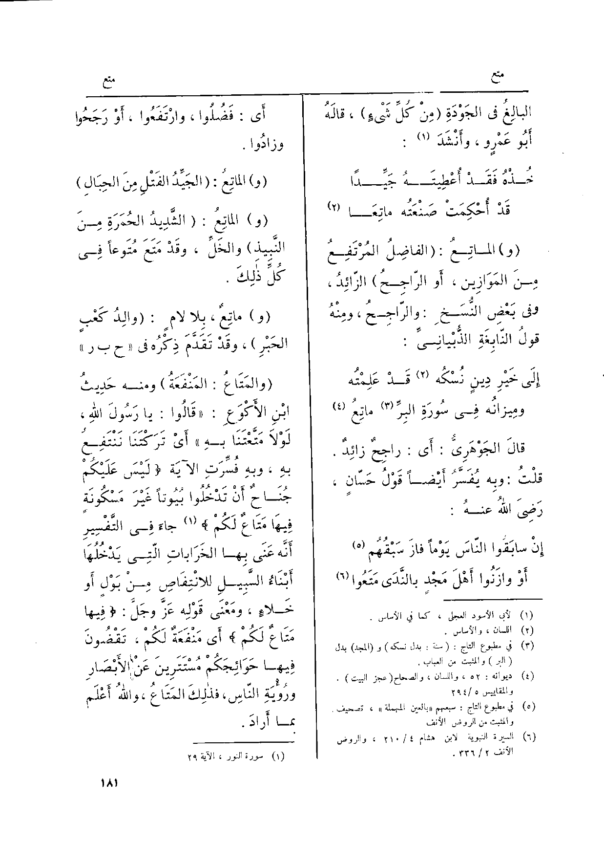 وماتِعٌ، بِلَا لامٍ: والِدُ كَعْبٍ الحَبْرِ، وقدْ تَقَدَّمَ ذِكرهُ فِي حبر والمَتَاعُ: المَنْفَعَةُ وَمِنْه حَديثُ ابنِ الأكْوَعِ: قالُوا يَا رسولَ اللهِ، لوْلاَ مَتَّعْتَنَا بهِ أيْ تَرَكْتَنا نَنْتَفِعُ بِهِ، وبهِ فُسِّرَتِ الآيةُ ليسَ عليْكُمْ جُناح أَن تَدْخُلُوا بُيُوتاً غَيْرَ مَسْكُونَةٍ فيهَا متاعٌ لكُمْ جاءَ فِي التَفْسيرِ أنَّه عَنَى بهَا الخَرَاباتِ الّتِي يَدْخُلُها أبْناءُ السَّبيل للانْتِفَاصِ منْ بَوْلٍ أَو خَلاءٍ، ومَعْنَى قَوْلِه عزَّ وجَلَّ: فِيهَا متَاعٌ لكُمْ أَي مَنْفَعَةٌ لَكُمْ، تَقْضُونَ فِيهَا حَوائِجَكُمْ مُسْتَتِرينَ عَن الأبْصَارِ ورُؤْيَةِ النَّاسِ، فذلكَ المَتَاعُ، واللهُ أعْلَم بِمَا أرادَ.