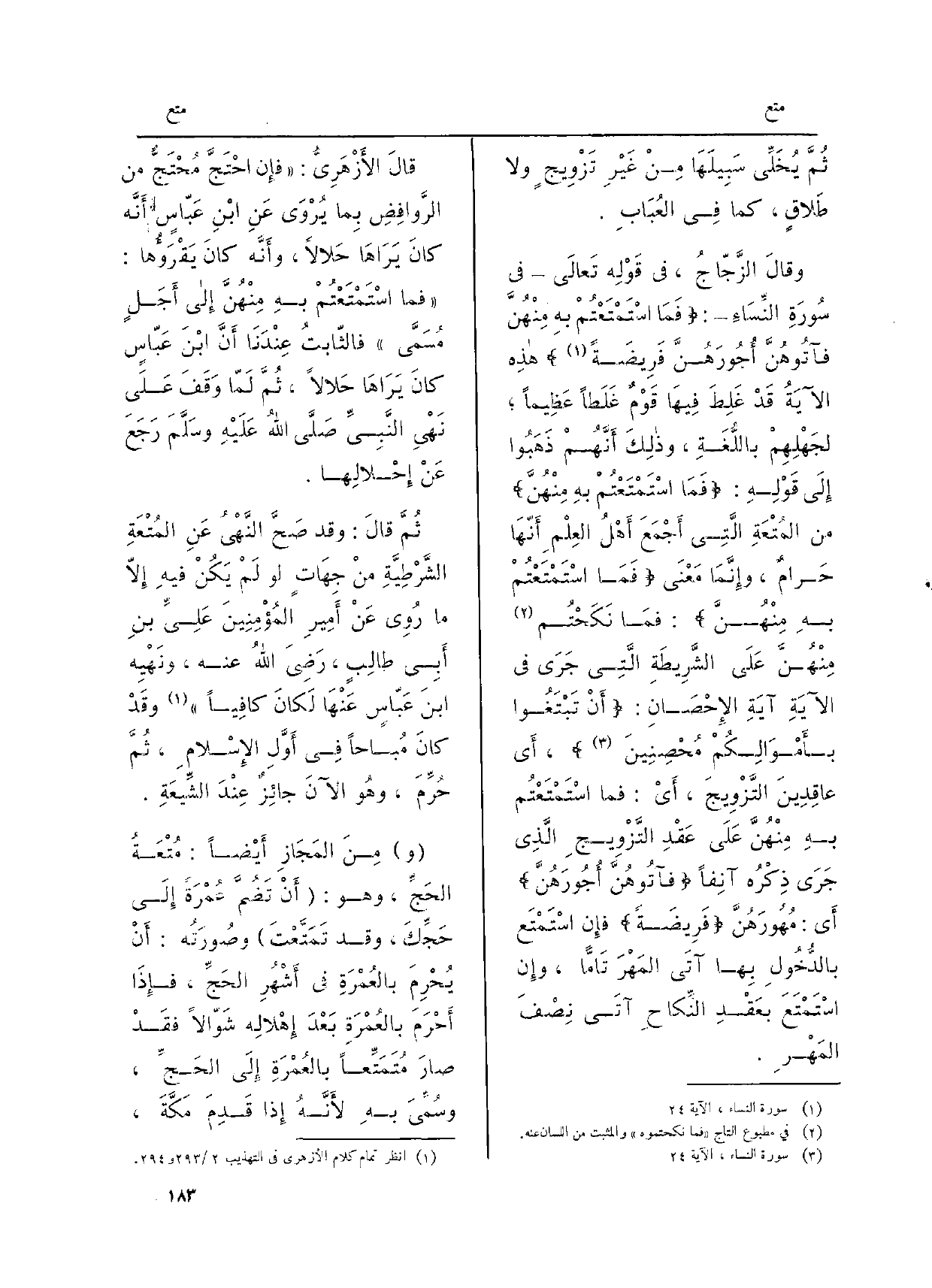وقالَ الزَّجاجُ، فِي قَوْلِه تَعَالَى فِي سُورَةِ النِّساءِ: فَمَا اسْتَمْتَعْتُم بهِ مِنْهُنَّ فآتُوهُنَّ أُجُورَهُنَّ فَرِيضَةً هَذِه الآيَةُ قَدْ غَلِطَ فِيهَا قَوْمٌ غَلطاً عَظِيماً، لجَهْلِهِم باللُّغَةِ، وَذَلِكَ أنَّهُم ذَهَبُوا إِلَى قَوْلهِ: فَمَا استَمْتَعْتُمْ بهِ مِنْهُنَّ من المُتْعَةِ الّتِي أجْمَعَ أهْلُ العِلْمِ أنَّهَا حَرامٌ، وإنَّما مَعْنَى فمَا اسْتَمتَعْتُم بهِ منْهُنَّ: فَمَا نَكَحْتُم منْهُنَّ على الشَّرِيطَةِ الّتِي جَرَى فِي الآيَةِ آيَةِ الإحْصَانِ: أنْ تَبْتَغُوا بأمْوالكِمْ مُحْصِنينَ، أَي: عاقِدينَ التَّزْويجَ، أَي: فَمَا استمتعْتُم بهِ منهُنَّ على عَقْدِ التَّزْويجِ الّذِي جَرَى ذِكْره آنِفاً: فآتُوهُنَّ أجُورَهُنَّ، أَي: مُهُورَهُنَّ فَرِيضَةً، فَإِن استَمْعَ بالدُّخُولِ بهَا آتى المَهْرَ تَامّاً، وَإِن اسْتَمْتَعَ بعَقْدِ النِّكاحِ آتَى نِصْفَ المَهْرِ.