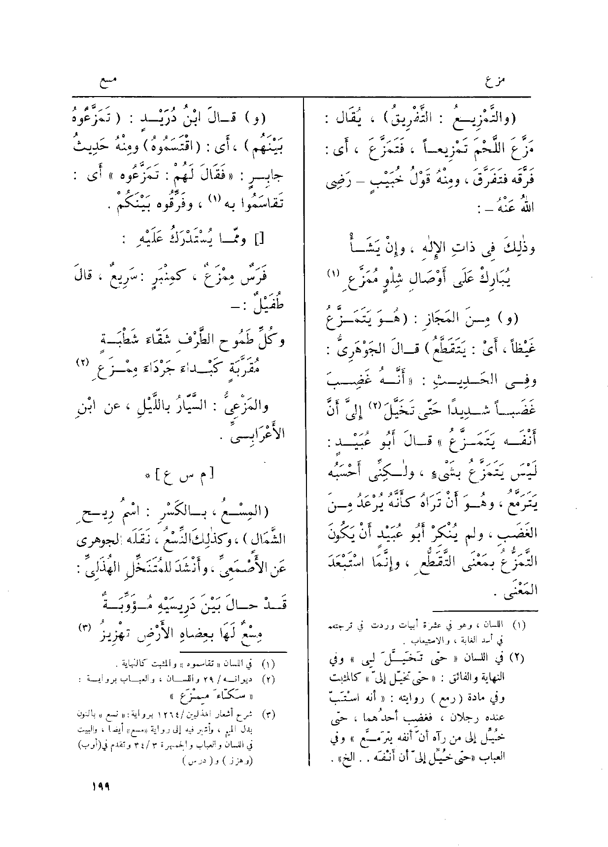 والتَّمْزِيعُ: التَّفْرِيقُ، يُقَالُ: مَزَّعَ اللَّحْمَ تَمْزِيعاً، فَتَمَزَّعَ، أَي: فَرَّقَه فتَفَرَّقَ، ومِنْهُ قَوْلُ خُبَيْبٍ رَضِي الله عَنهُ: وذلكَ فِي ذاتِ الإلهِ، وإنْ يَشَأْيُبَارِكْ على أوْصَالِ شِلْوٍ مُمَزَّعِ وَمن المَجَازِ: هُوَ يَتَمَزَّعُ غَيْظاً، أَي: يَتَقَطَّعُ قالَ الجَوْهَرِيُّ: وَفِي الحدِيثِ: أنَّهُ غَضِبَ غَضباً شَديداً حَتَّى تَخَيَّلَ إليَّ أنَّ أنْفَه يَتَمَزَّعُ قالَ أَبُو عُبَيْدٍ: لَيْسَ يَتَمَزَّعُ قالَ أَبُو عُبَيدٍ: لَيْسَ يَتَمَزَّعُ بشَيْءٍ: ولكنِّي أحْسَبُه يَتَرَمَّعُ، وهُوَ أنْ تَرَاهُ كأنَّهُ يُرْعَدُ منَ التَّمَزُّعُ بمَعْنَى التَّقَطُّعِ، وإنَّمَا اسْتَبْعَدَ المَعْنَى.