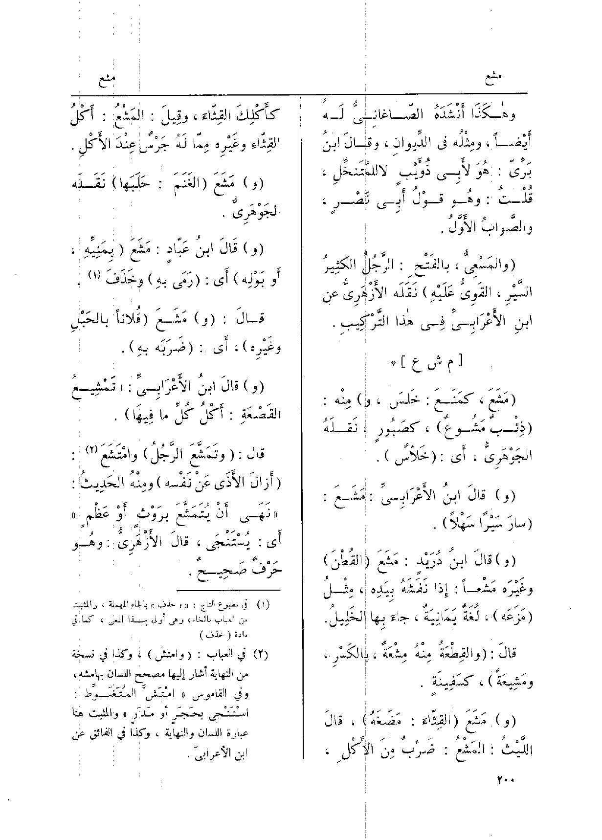ومَشَعَ القِثّاءَ: مَضغَهُ، قالَ اللَّيْثُ: المَشْعُ: ضَرْبٌ منَ الأكْلِ، كأكْلِكَ القِثّاءَ، وقيلَ: المَشْعُ: أكْلُ القِثّاءِ وغَيْرِه ممّا لَهُ جَرْسٌ عِنْدَ الأكْلِ.