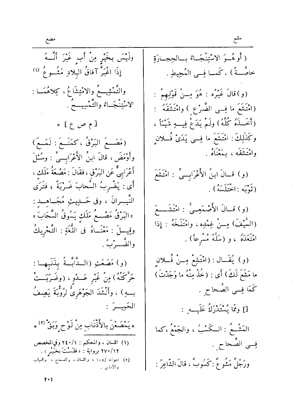مَصَعَ البَرْقُ، كمَنَعَ: لمَعَ وأوْمَضَ، قالَ ابنُ الأعْرَابِيّ وسُئلَ أعْرَابِيُّ عَن البَرْقِ، فقالَ: مَصْعَةُ مَلَكٍ، أَي: يَضْرِبُ السَّحابَ ضَرْبَةً، فتَرَى النِّيرانَ، وَفِي حديثِ مُجَاهِدٍ: البَرْقُ مَصْعُ مَلَكٍ يَسُوقُ السَّحَابَ وقِيلَ: مَعْنَاهُ فِي اللُّغَةِ: التَّحْريكُ والضَّرْبُ.