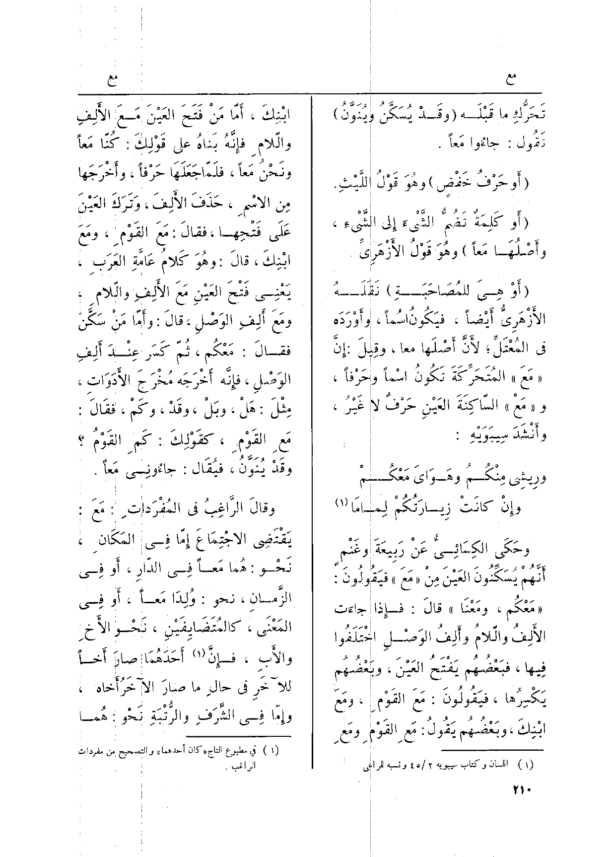 وحَكَى الكِسائِيُّ عَن رَبِيعَةَ وغَنْمٍ أنَّهُمْ يُسَكِّنُونَ العَيْنَ منْ مَعَ فيَقُولُونَ: مَعْكُم،} ومَعْنَا قالَ: فَإِذا جاءَت الألِفُ واللامُ وألفُ الوَصْلِ اخْتَلَفُوا فِيهَا، فَبْعضُهم يَفْتَحُ العَيْنَ، وبَعْضُهم يَكْسِرُها، فيَقُولونَ: معَ القَومِ، ومعَ ابنِكَ، وبَعْضُهُم يَقُولُ: معِ القَوْمِ ومَعِ ابْنِكَ، أما منْ فَتَحَ العَيْنَ معَ الألِفِ واللامِ فإنَّهُ بضناهُ على قَوْلِكَ: كُنّا مَعاً ونَحْنُ مَعًا، فلمّا جَعَلَها حَرْفاً، وأخْرَجَها منْ الاسْمِ، حَذَفَ الألفَ، وتَرَكَ العَيْنَ على فَتْحِها، فقالَ: مَعَ القَوْمِ، ومَعَ ابْنِكَ، قالَ: وهُوَ كَلامُ عامَّةِ العَرَبِ، يَعْنِي فَتْحَ العَيْنِ مَعَ)