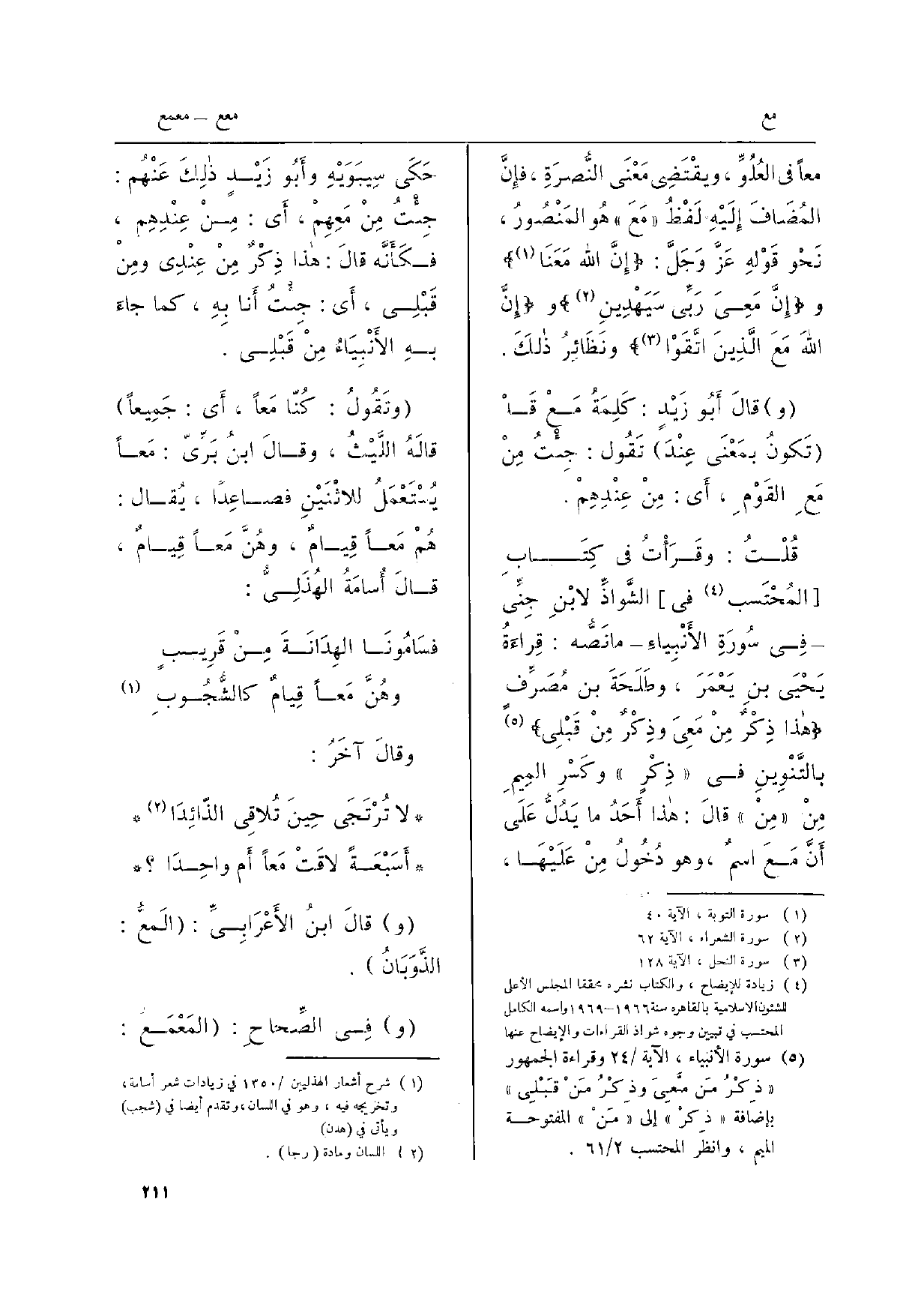 وقالَ أَبُو زَيْدٍ: كَلِمَةُ مَعْ قدْ تَكونُ بمعْنَى عِنْدَ تَقُول: جِئْتُ منْ مَعِ القَوْمِ، أَي: مِنْ عِنْدِهِمْ. قُلْتُ: وقَرَأْتُ فِي كِتَابِ المُحْتَسب فِي الشَّواذِّ لابْنِ جَنِّي فِي سُورَةِ الأنْبِياءِ مَا نَصُّ: قِراءَةُ يَحْيَى بنِ يَعْمَر، وطَلَحَةَ بن مُصَرِّفٍ هَذَا ذِكْرٌ منْ مَعِيَ وذِكْرٌ منْ قَبْلي بالتَّنْوينِ فِي ذِكْرٍ وكَسْرِ المِيمِ منْ مِنْ قالَ: هَذَا أحَدُ مَا يَدُّلُ على أنَّ معَ اسمٌ، وَهُوَ دُخُولُ مِنْ عَليْهَا، حَكى سِيبويْهِ وأبوُ زَيْدٍ ذلكَ عَنْهُم: جِئتُ منْ {مَعِهِمْ، أَي: منْ عِنْدِهم، فكأنّه قالَ: هَذَا ذِكْرٌ من عِنْدِي ومنْ قَبْلِي، أَي: جِئتُ أَنا بهِ، كَمَا جاءَ بهِ الأنْبِياءُ منْ قَبْلِي.