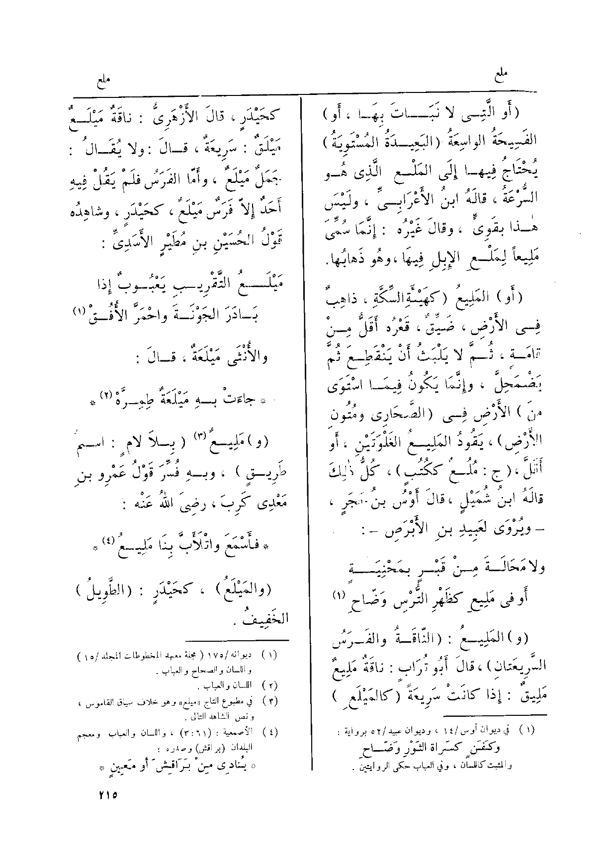 والأُنْثَى مَيْلَعَةٌ، قالَ: جاءَتْ بهِ مَيْلَعَةٌ طِمِرَّهْ ومَلِيعٌ بِلَا لامٍ: اسمُ طَرِيقٍ، وبهِ فُسِّرَ قَوْلُ عَمْرو بنِ مَعْدِي كَرِبَ، رضيَ اللهُ عنهُ: فأسْمَعَ واتْلأبَّ بِنَا مَلِيعُ والمَيْلَعُ، كحَيْدَرٍ: الطَّوِيلُ الخَفِيفُ.