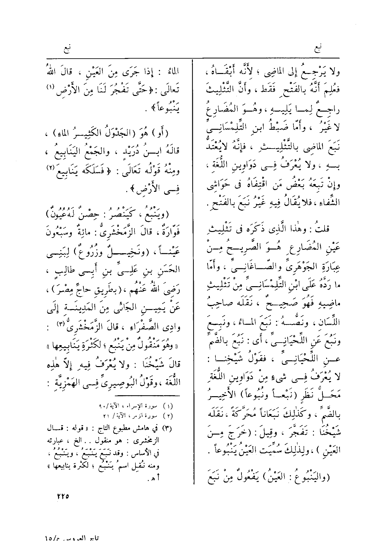 واليَنْبُوعُ: العَيْنُ يَفْعثولٌ منْ نَبَعَ الماءُ: إِذا جَرَى منَ العَيْنِ، قالَ اللهُ تَعالى: حَتَّى تَفْجُرَ لنا منَ الأرْضِ يَنْبُوعاً.