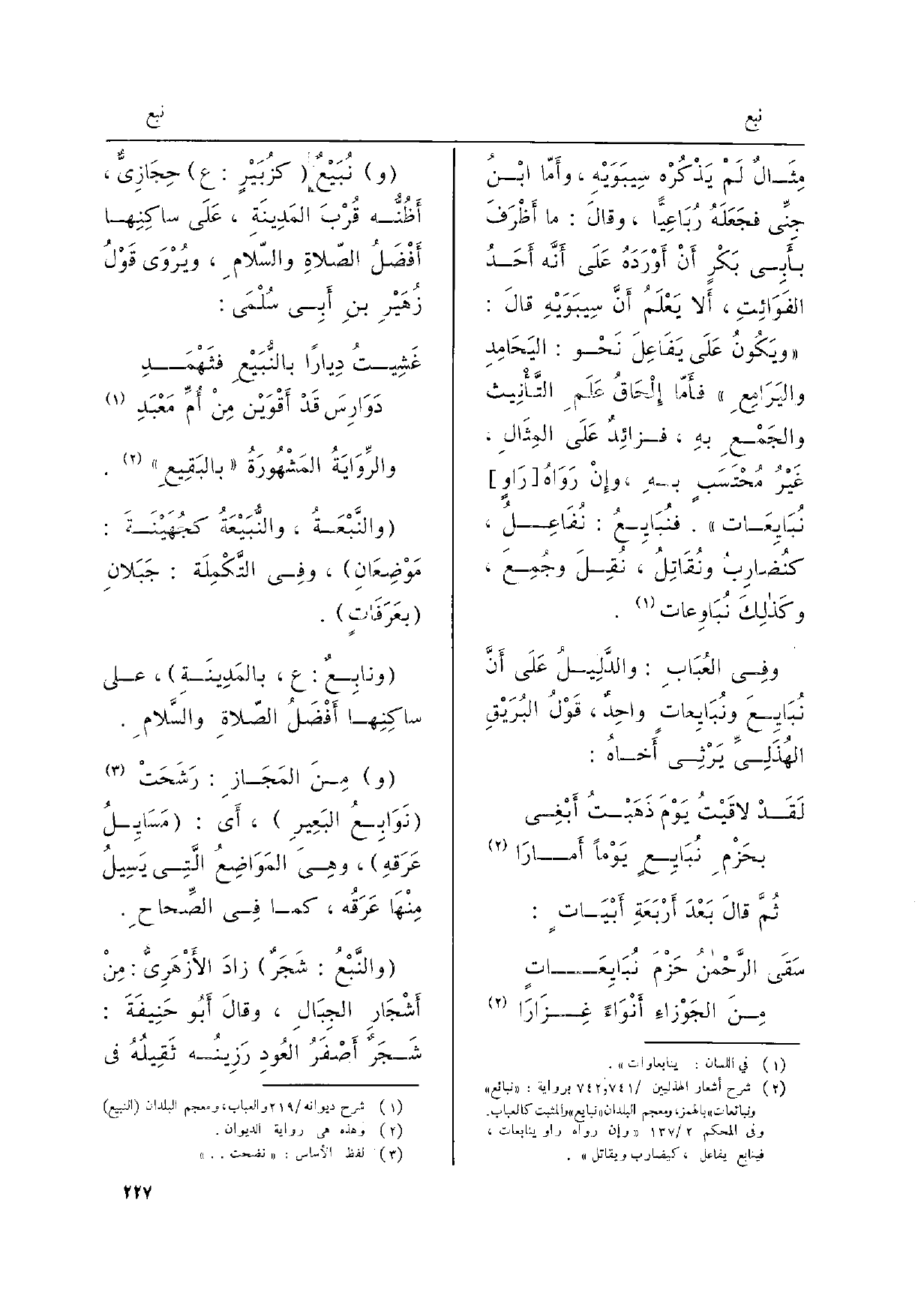 ونُبَيْعٌ كزُبَيْرٍ: ع حِجَازِيٌّ، أظُنُّه قُرْبَ المَدينَةِ، على ساكِنِها أفْضَلُ الصلاةِ والسلامِ، ويُرْوَى قَوْلُ زُهَيْر بن أبي سُلْمَى: