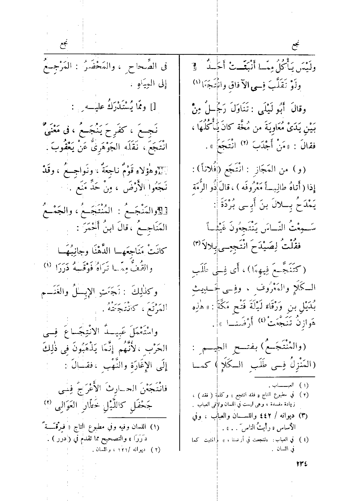 كتَنَجَّع فيهِمَا، أَي فِي طَلَبِ الكَلإِ والمَعْرُوفِ، وَفِي حَدِيث بُدَيْلِ بنِ وَرْقَاءَ لَيْلَةَ فَتْحِ مَكَّةَ: هَذِه هَوازِنُ تَنَجَّعَتْ أرْضَنا.
