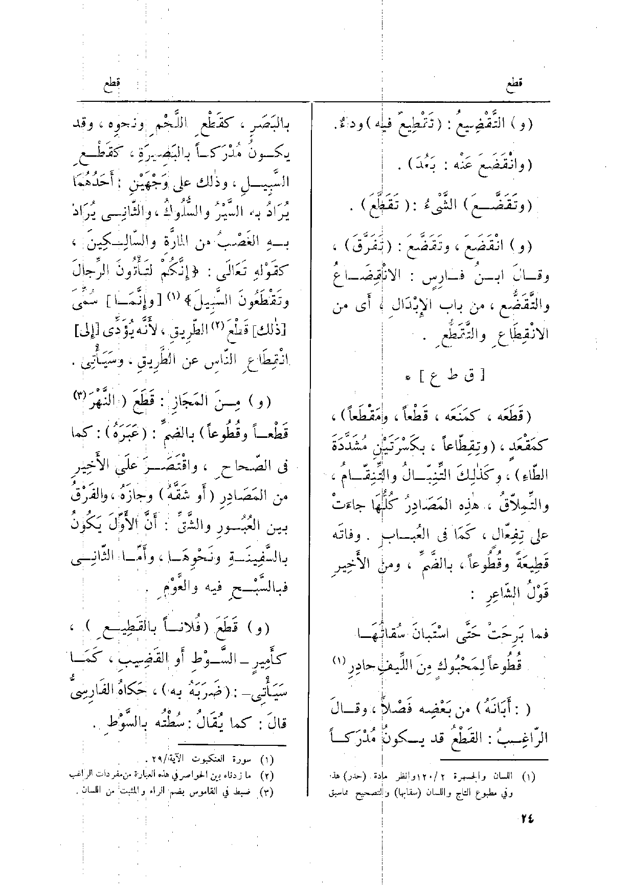 أبَانَهُ: من بَعْضِه فَصْلاً، وقالَ الرّاغِبُ: القَطْعُ قد يكونُ مُدْرَكاً بالبَصَر، كقَطْعِ اللَّحْمِ وَنَحْوه، وَقد يكونُ مُدْرَكاً بالبَصِيرَةِ، كقَطْعِ السَّبِيلِ وَذَلِكَ على وَجْهَيْنِ: أحَدُهُمَا يُرَادُ بِهِ السَّيْرُ والسُّلُوكُ، والثّاني يُرَاد بهِ الغَصْبُ من المارَّةِ والسَّالِكِينَ، كقَوْلِهِ تَعالَى: إنَّكُمْ لتَأتُونَ الرِّجالَ وتَقْطَعُونَ السَّبيلَ وإنَّما سُمِّيَ ذَلِك قَطْعَ الطّرِيقِ، لأنَّه يُؤَدِّي إِلَى انْقِطَاعِ النّاسِ عَن الطَّرِيقِ، وسيأْتي.