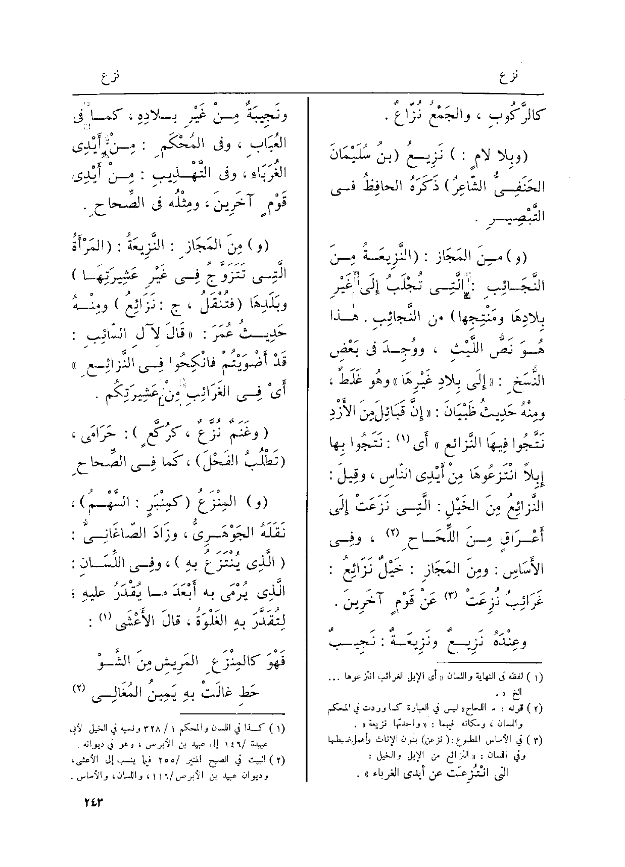 وَمن المَجَازِ: النَّزِيعَةُ منَ النَّجَائِبِ: الّتِي تُجْلَبُ إِلَى غَيْرِ بِلادِهَا ومَنْتِجِها من النَّجائِبِ، هَذَا هوَ نَصُّ اللَّيْثِ، ووُجِدَ فِي بَعْضِ النُّسَخِ: إِلَى بِلادِ غَيْرِهَا وهُو غَلَطٌ، ومِنْهُ حَديثُ ظَبْيانَ: إنَّ قَبائِلَ منَ الأزْدِ نَتَّجُوا فيهَا النَّزائع أَي: نَتَجُوا بِها إبِلاً انْتَزعُوهَا منْ أيْدِي النّاسِ، وقيلَ: النَّزائِعُ منَ الخَيْلِ: الّتِي نَزَعَتْ إِلَى أعْرَاقٍ منَ اللِّحَاحِ، وَفِي الأسَاسِ: وَمن المَجَازِ: خَيْلٌ نَزَائِعُ: غَرَائِبُ نُزِعَتْ عنْ قَوْمٍ آخَرِينَ.