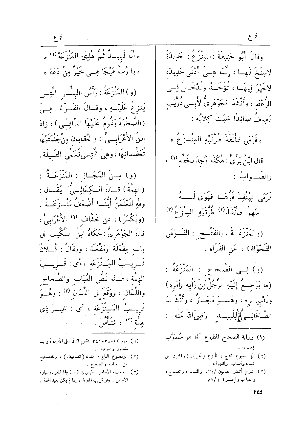 وقالَ أَبُو حَنِيفَةَ: المِنْزَعُ: حَدِيدَةٌ لَا سِنْخَ لَها، إنَّمَا هِيَ أدْنَى حَديدَة لَا خَيْرَ فِيهَا، تُؤْخَذُ وتُدْخَلُ فِي الرُّعْظِ، وأنْشَدَ الجَوْهَرِيُّ لأبي ذُؤَيْبٍ يَصِفُ صائِداً غَلبَتْ كِلابُه: فَرَمَى فأنْفَذَ طُرَّتَيْهِ المِنْزَعُ قَالَ ابنُ بَرِّيّ: هَكَذَا وُجِدَ بخَطِّهِ، والصّوابُ: