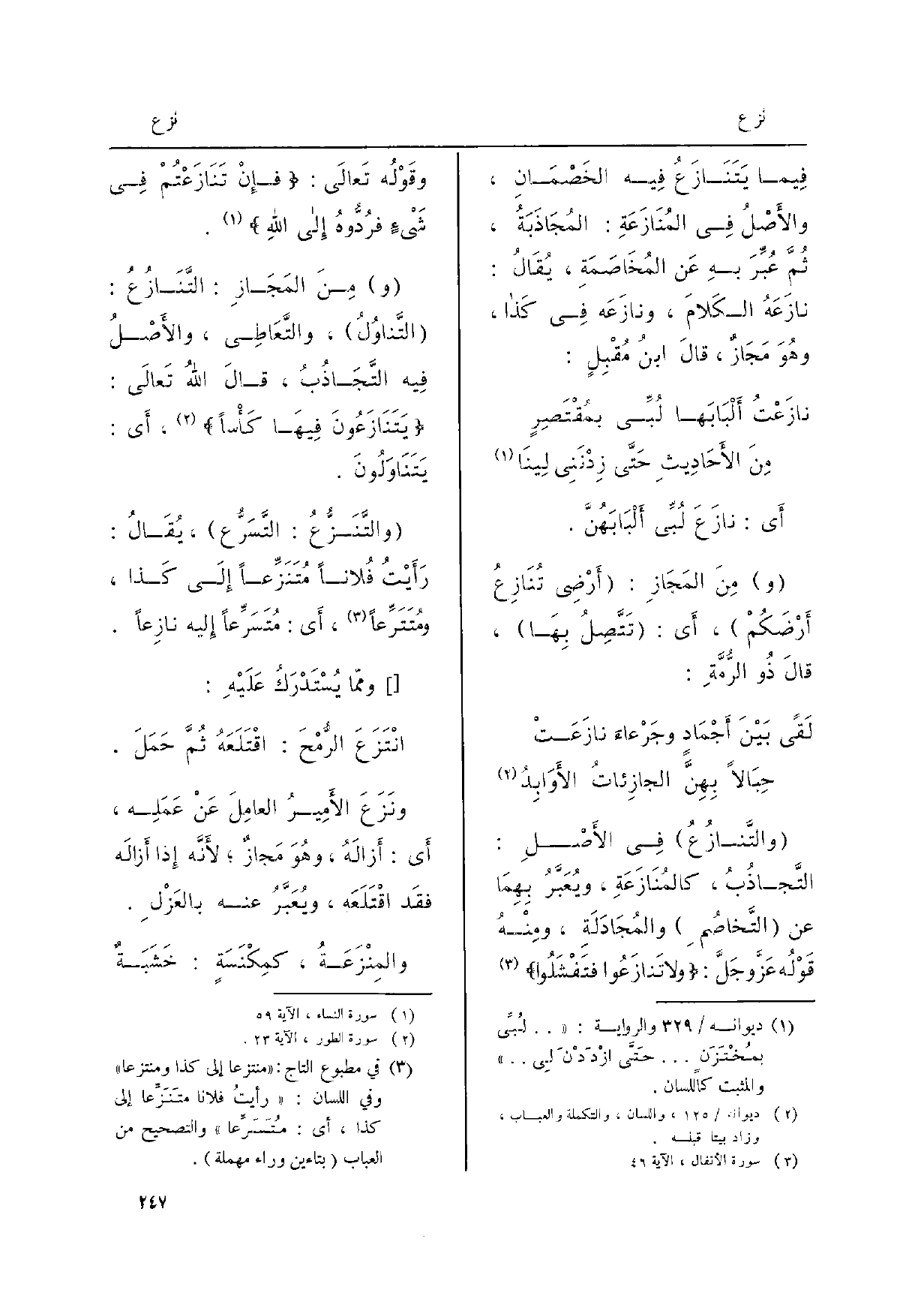 والتَّنازُعُ فِي الأصْلِ: التَّجاذُبُ، كالمُنَازَعَةِ، ويُعَبَّرُ بهِمَا عَن التَّخَاصُمِ والمُجَادَلَةِ، ومِنْهُ قَوْلُه عَزَّ وجَلَّ: وَلَا تَنازَعوا فتَفْشَلُوا وقَوْلُه تعالَى: فإنْ تَنازَعْتُمْ فِي شَيءٍ فرُدُّوهُ إِلَى اللهِ.