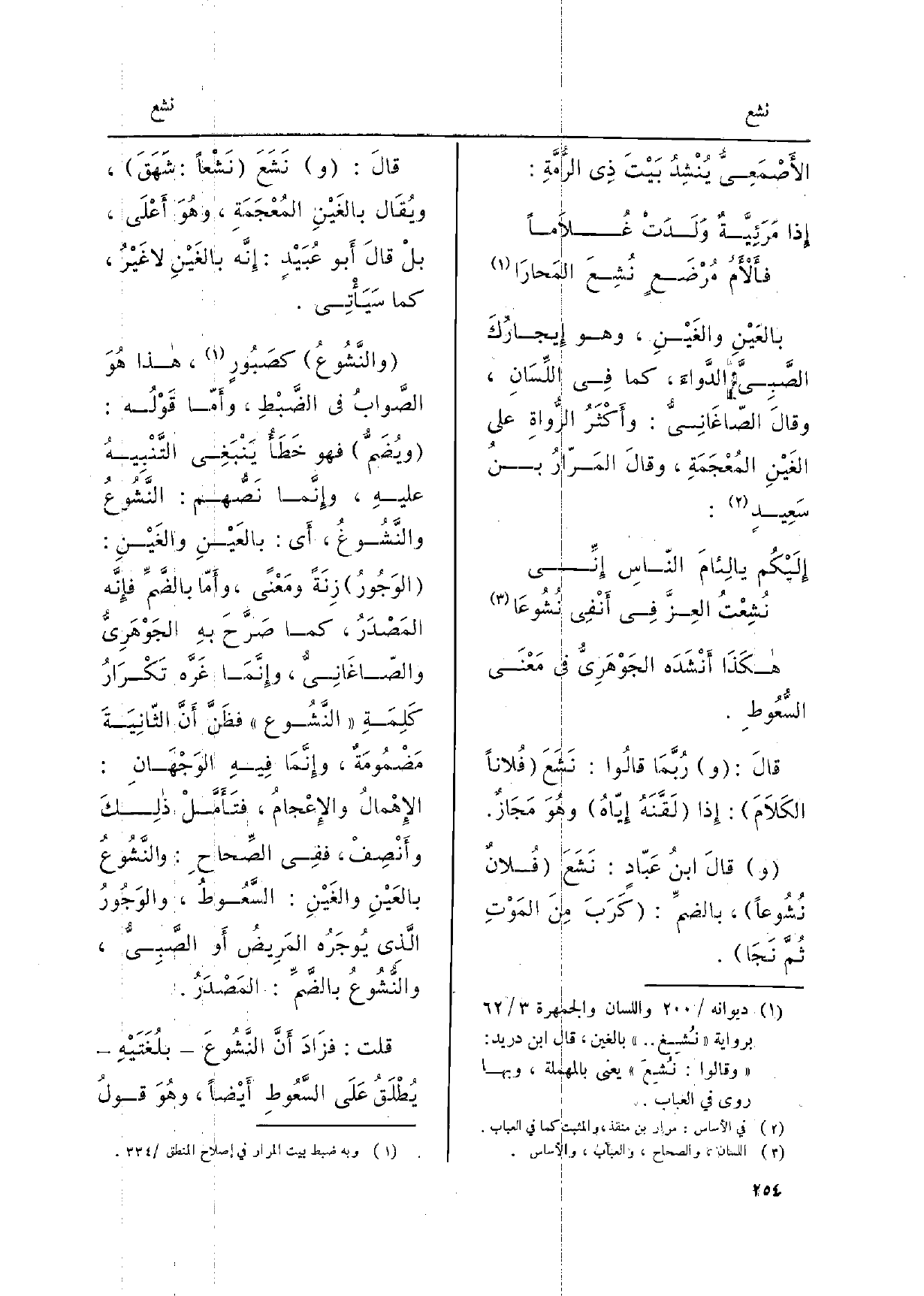 والنَّشُوعُ كصَبورٍ، هَذَا هُوَ الصَّوابُ فِي الضَّبْطِ، وأمّا قَوْلُه: ويُضَمُّ فَهُوَ خَطَأُ يَنْبَغِي التَّنْبِيهُ عليهِ، وإنَّما نَصُّهم: النَّشُوعُ والنَّشُوغُ، أَي: بالعَيْنِ والغَيْنِ: الوَجُورُ زِنَةً ومَعْنىً، وأمّا بالضَّمِّ فإنَّه المَصْدَرُ كَمَا صَرَّحَ بهِ الجَوْهَرِيُّ والصّاغَانِيُّ وإنَّمَا غَرَّه تَكْرارُ كَلِمَةِ النَّشُوع فظَنَّ أنَّ الثّانِيَةَ مَضْمُومَةٌ، وإنَّمَا فيهِ الوَجْهانِ: الإهْمالُ والإعْجامُ، فتأمَّلْ ذَلِك وأنْصِفْ، فَفِي الصِّحاحِ: والنَّشُوعُ بالعَيْنِ والغَيْنِ: السَّعُوطُ، والوَجُورُ الّذِي يُوجَرُه المَرِيضُ أَو الصَّبِيُّ، والنُّشُوعُ بالضَّمِّ: المَصْدَرُ.